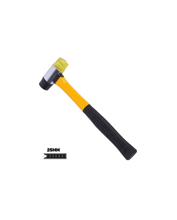 Martillo antirrebote de doble cara de golpeo, constituido por una cara de poliuretano y otra cara de nylon con mango de fibra de vidrio con recubrimiento de goma antideslizante. Martillo de goma diseado para efectar golpeos firmes y controlados en superficies y piezas sin llegar a daarlas o marcarlas: alineacin de piezas, golpeo de superficies pintadas y pulidas, montajes, ensamblaje de materiales, instalacin de ventanas, etc. 25mm