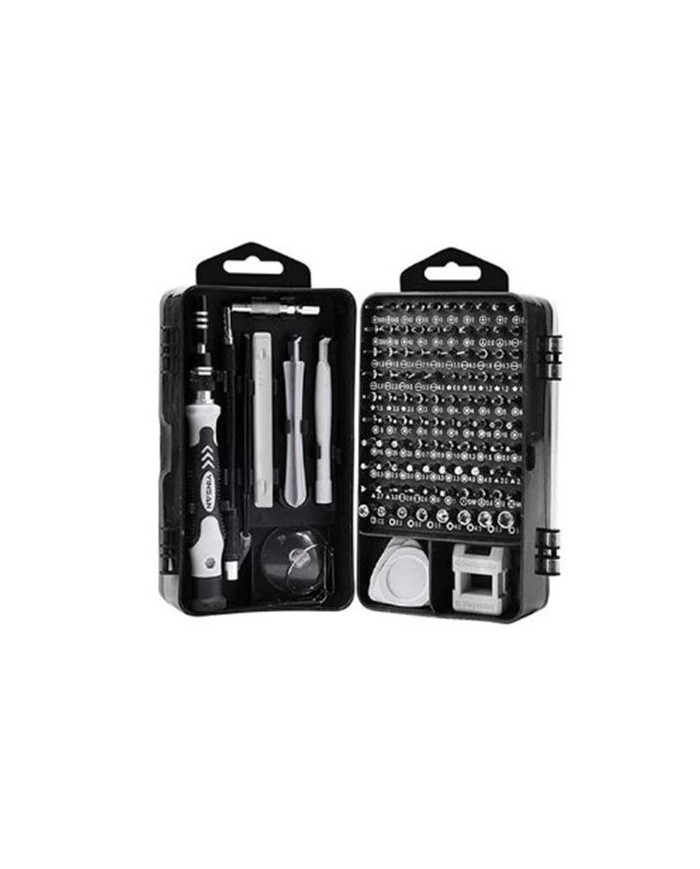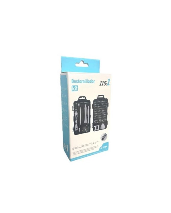 Kit completo de destornilladores de precisin con 115 piezas. Diseo porttil y compacto, ideal para uso profesional o domstico. Mango antideslizante y ergonmico para mayor comodidad durante el uso. Puntas imantadas que facilitan la sujecin de tornillos pequeos. Amplia variedad de puntas intercambiables, compatibles con mltiples tipos de tornillos. Incluye herramientas adicionales para reparacin y apertura de dispositivos electrnicos. Fabricado con materiales de alta calidad y durabilidad. Ideal para reparacin de smartphones, tablets, laptops, consolas, relojes y ms. 1 mango principal con extensin flexible. 98 puntas de precisin. 1 pinza metlica. 1 ventosa. 1 herramienta de apertura tipo paleta