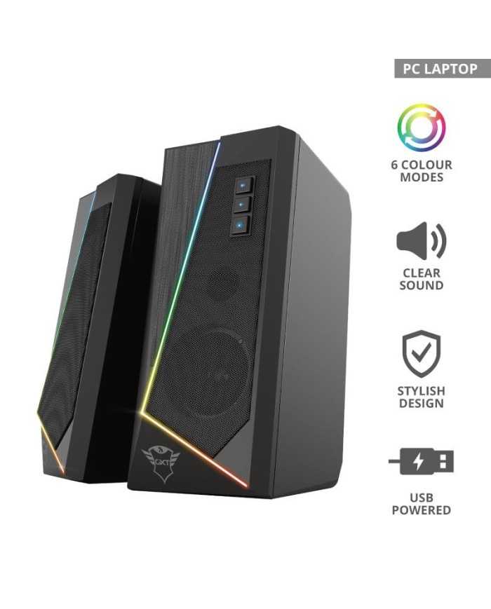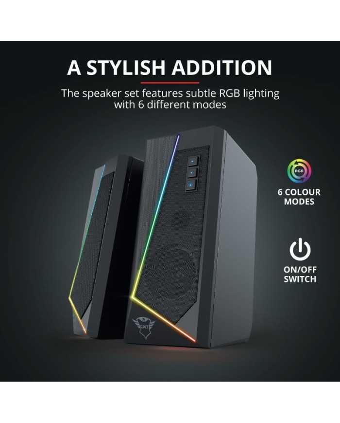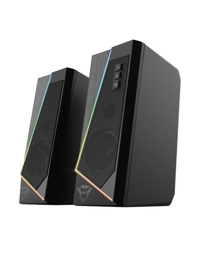 _x000D_Gracias a su diseo estilizado y a la sutil iluminacin RGB, el juego de auriculares GXT 609 Zoxa de Trust es un complemento elegante para cualquier escritorio. Adems, este juego de altavoces estreo es fcil de usar y ni siquiera requiere un enchufe de pared. Se enciende automticamente al encender el PC.