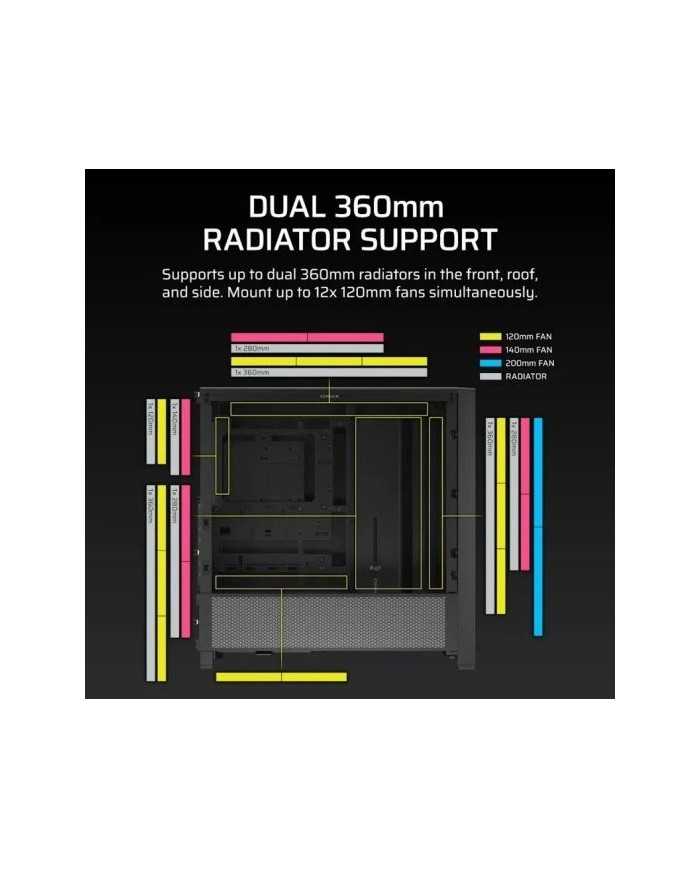 - SOPORTE DE RADIADOR DOBLE DE 360 mm. Refuerce su refrigeración con tres puntos de montaje exclusivos para radiadores de 360 mm: panel frontal, superior y lateral. Puede montar hasta 10 ventiladores de 120 mm simultáneamente, lo que garantiza un flujo de entrada de aire frío continuo y una salida eficiente del aire caliente._x000D_