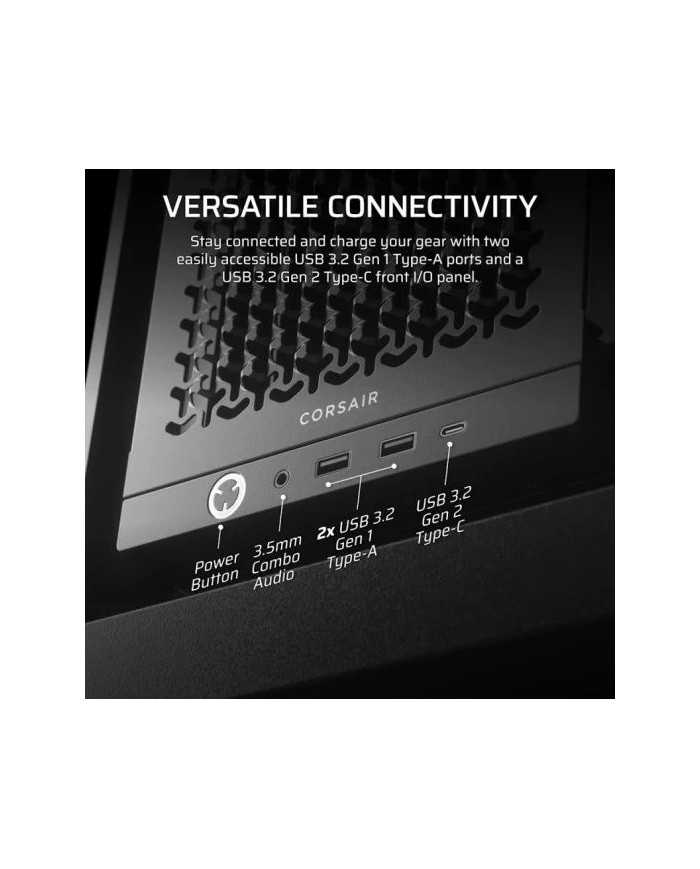 - MODERNO PANEL FRONTAL DE E/S. Deja las conexiones a su alcance, con un puerto USB 3.2 Gen 2 de tipo C, dos puertos USB 3.2 Gen 1 de tipo A, y un conector de micrófono y audio._x000D_