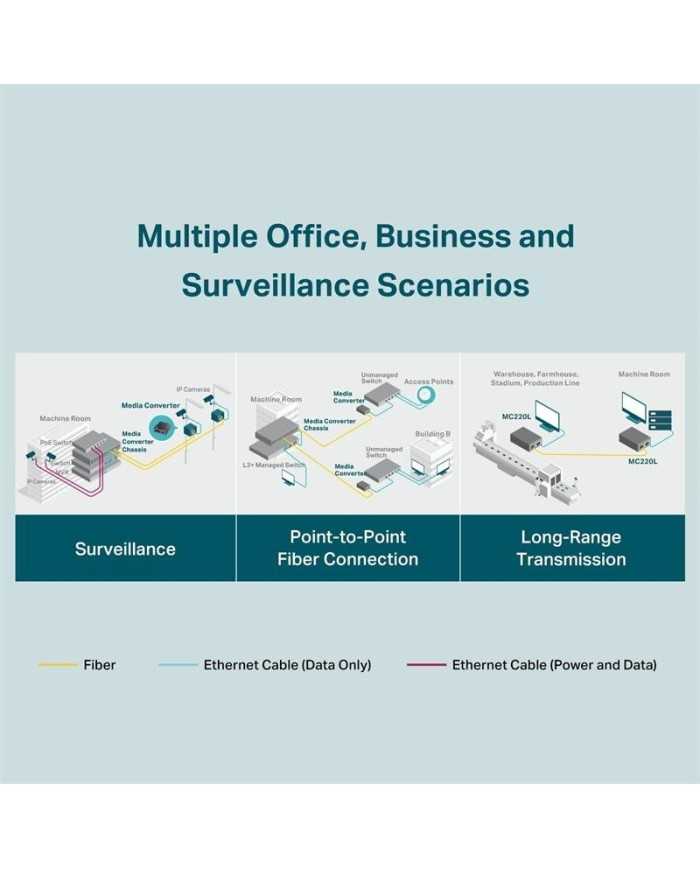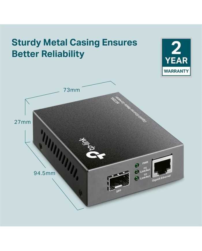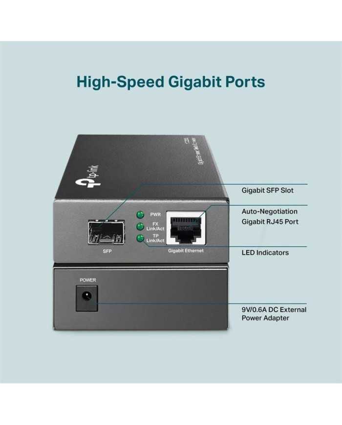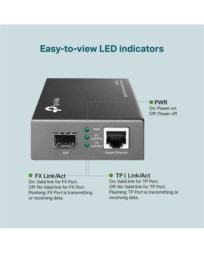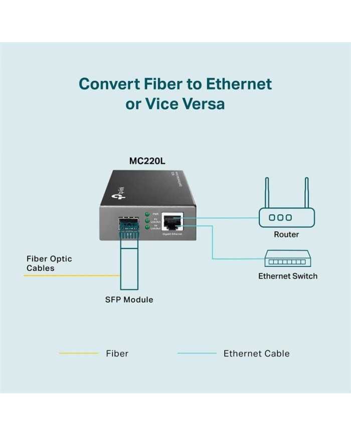 El TP-LINK MC220L es un convertidor de seal elctrica (Gigabit de cobre mediante conector RJ45) a seal ptica (fibra monomodo o multimodo mediante conector LC)* o viceversa.