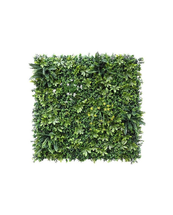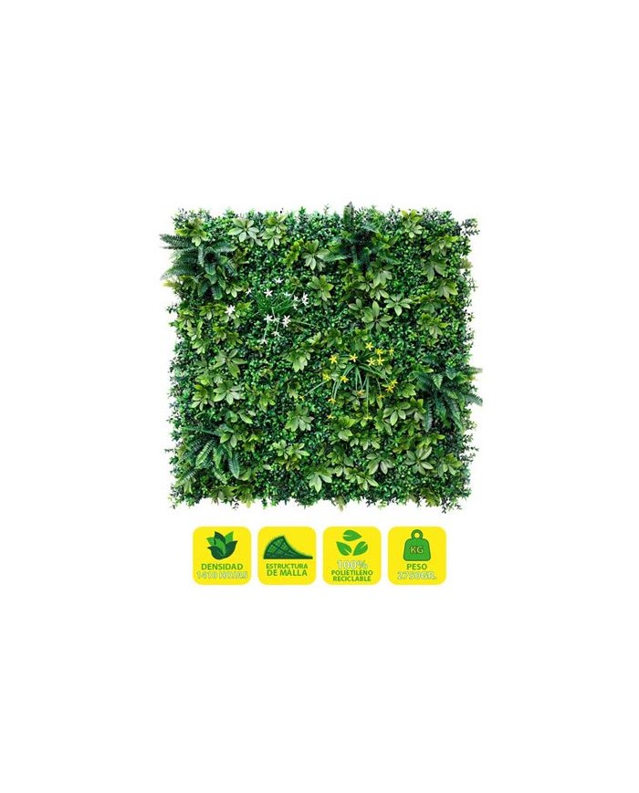 Jardin vertical artificial, ideal para decorar terrazas, balcones, paredes, techos, columnas, etc. Transforma tu espacio al instante. Crea zonas ms acogedoras de forma rpida y sencilla con plantas sintticas de calidad Sin mantenimiento. Si eres olvidadizo o no tienes tiempo para cuidar de tus plantas, la solucin sinttica te permite olvidarte de regar, cortar, abonar... Suponiendo un gran ahorro de tiempo y agua. Cuentan con un sencillo sistema de instalacin. Esta solucin, robusta, pero sencilla, permite desmontar y volver a montar los paneles con facilidad. Fabricado con hojas artificiales unidas a una malla no apreciable una vez instalada. Diseados para durar: estn fabricados con materiales de calidad. Tienen proteccin contra los rayos
