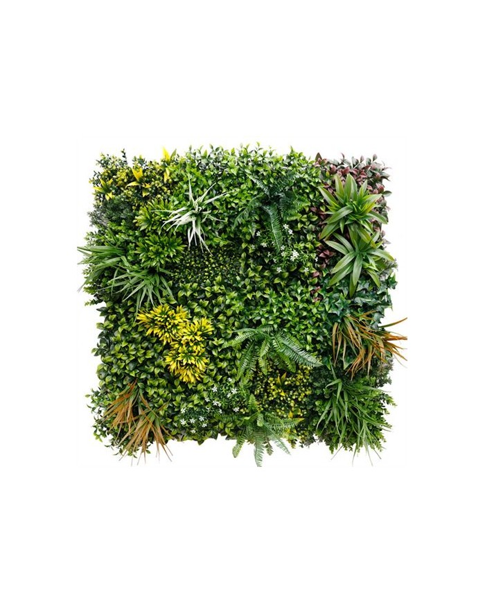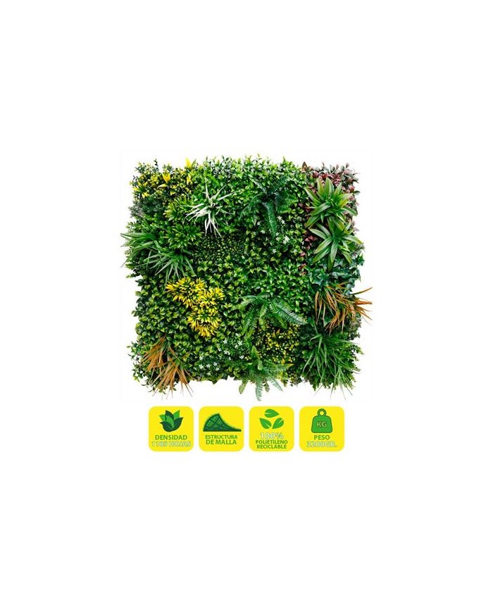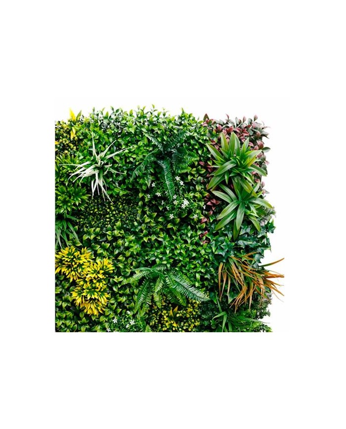 Jardin vertical artificial, ideal para decorar terrazas, balcones, paredes, techos, columnas, etc. Transforma tu espacio al instante. Crea zonas ms acogedoras de forma rpida y sencilla con plantas sintticas de calidad Sin mantenimiento. Si eres olvidadizo o no tienes tiempo para cuidar de tus plantas, la solucin sinttica te permite olvidarte de regar, cortar, abonar... Suponiendo un gran ahorro de tiempo y agua. Cuentan con un sencillo sistema de instalacin. Esta solucin, robusta, pero sencilla, permite desmontar y volver a montar los paneles con facilidad. Fabricado con hojas artificiales unidas a una malla no apreciable una vez instalada. Diseados para durar: estn fabricados con materiales de calidad. Tienen proteccin contra los rayos
