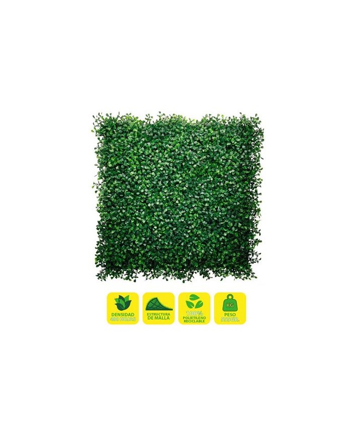 Jardin vertical artificial, ideal para decorar terrazas, balcones, paredes, techos, columnas, etc. Transforma tu espacio al instante. Crea zonas ms acogedoras de forma rpida y sencilla con plantas sintticas de calidad Sin mantenimiento. Si eres olvidadizo o no tienes tiempo para cuidar de tus plantas, la solucin sinttica te permite olvidarte de regar, cortar, abonar... Suponiendo un gran ahorro de tiempo y agua. Cuentan con un sencillo sistema de instalacin. Esta solucin, robusta, pero sencilla, permite desmontar y volver a montar los paneles con facilidad. Fabricado con hojas artificiales unidas a una malla no apreciable una vez instalada. Diseados para durar: estn fabricados con materiales de calidad. Tienen proteccin contra los rayos