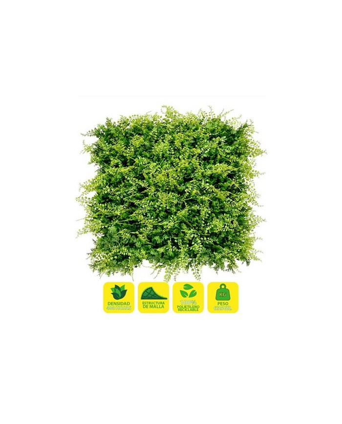 Jardin vertical artificial, ideal para decorar terrazas, balcones, paredes, techos, columnas, etc. Transforma tu espacio al instante. Crea zonas ms acogedoras de forma rpida y sencilla con plantas sintticas de calidad Sin mantenimiento. Si eres olvidadizo o no tienes tiempo para cuidar de tus plantas, la solucin sinttica te permite olvidarte de regar, cortar, abonar... Suponiendo un gran ahorro de tiempo y agua. Cuentan con un sencillo sistema de instalacin. Esta solucin, robusta, pero sencilla, permite desmontar y volver a montar los paneles con facilidad. Fabricado con hojas artificiales unidas a una malla no apreciable una vez instalada. Diseados para durar: estn fabricados con materiales de calidad. Tienen proteccin contra los rayos