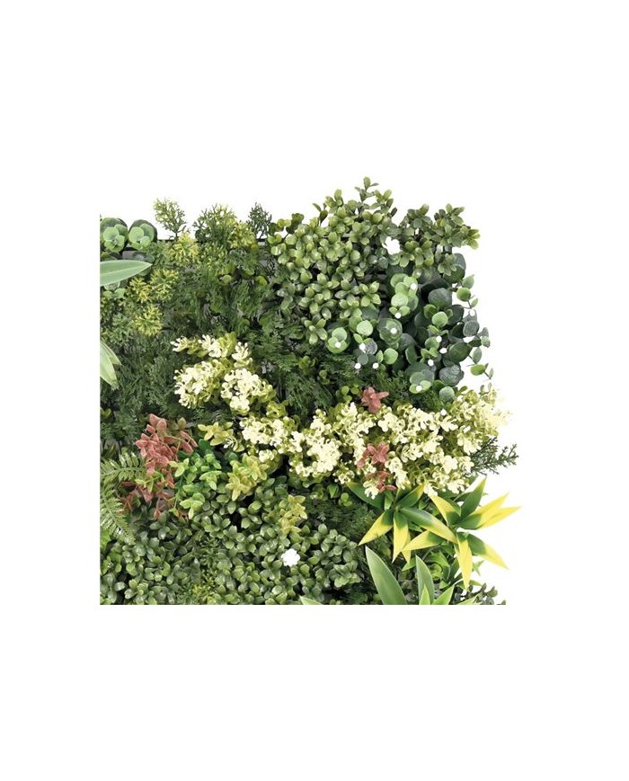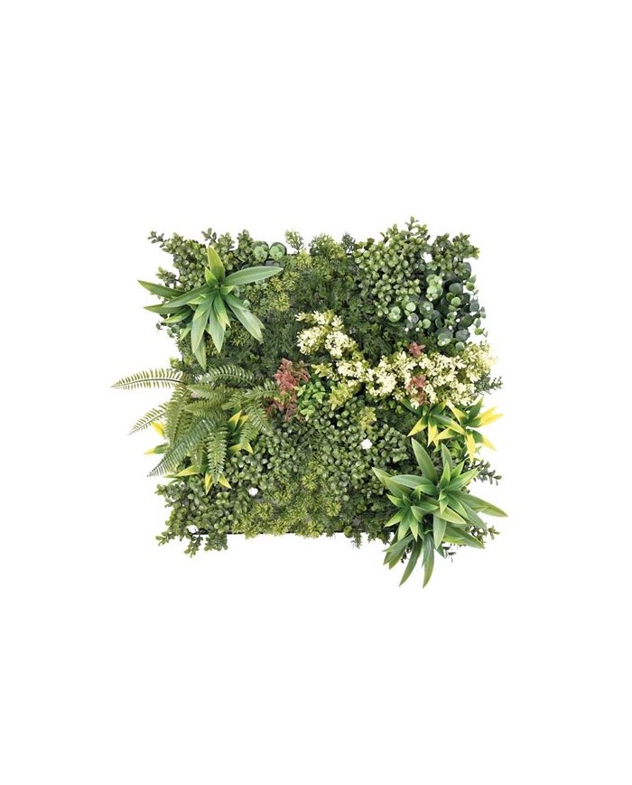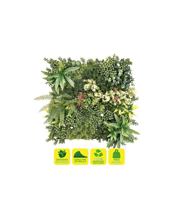Jardin vertical artificial, ideal para decorar terrazas, balcones, paredes, techos, columnas, etc. Transforma tu espacio al instante. Crea zonas ms acogedoras de forma rpida y sencilla con plantas sintticas de calidad Sin mantenimiento. Si eres olvidadizo o no tienes tiempo para cuidar de tus plantas, la solucin sinttica te permite olvidarte de regar, cortar, abonar... Suponiendo un gran ahorro de tiempo y agua. Cuentan con un sencillo sistema de instalacin. Esta solucin, robusta, pero sencilla, permite desmontar y volver a montar los paneles con facilidad. Fabricado con hojas artificiales unidas a una malla no apreciable una vez instalada. Diseados para durar: estn fabricados con materiales de calidad. Tienen proteccin contra los rayos