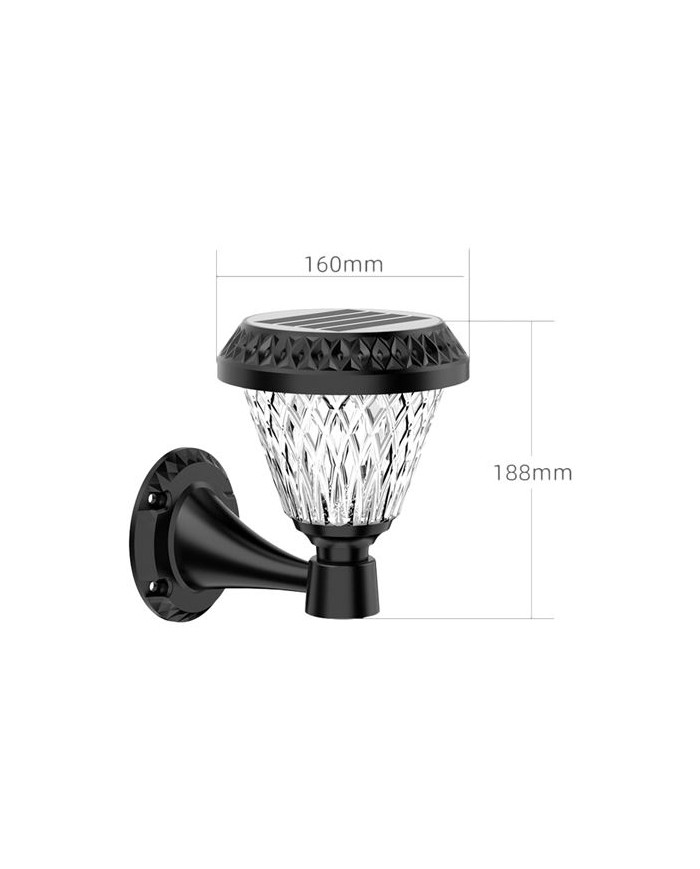Luz fria, 6500K 250 Lmenes Batera: 3.2V, 2000mAh Panel Solar 5V / 2W IP65 Tiempo de carga: 3 - 5 horas aprox. Tiempo de uso: 10 - 12 horas aprox. ngulo: 360 Modo de trabajo - Siempre encendido cuando no hay luz Dimensiones: 16x18.8cm