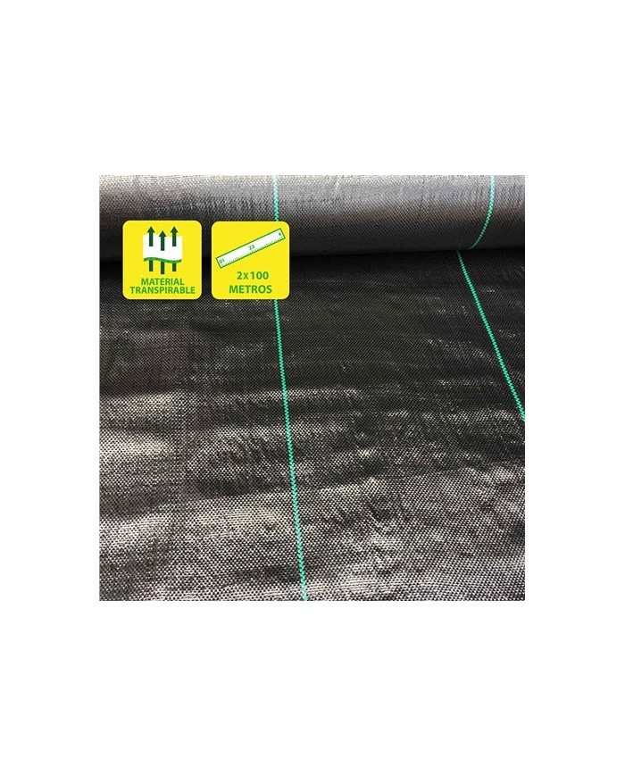 La Malla antihierbas 100 gr/m es usada generalmente en agricultura y jardinera, tiene como objetivo proteger los cultivos de plagas y de hierbas no deseadas. Su aplicacin en agricultura sirve para evitar el crecimiento de malas hierbas, permitiendo al mismo tiempo respirar y mantener la humedad del suelo. En el caso de la jardinera, tambin evita el crecimiento de hierbas no deseadas y permite la aplicacin de elementos decorativos, como piedras decorativas. 100 gr/m2 Dimensiones rollo: 2x100 metros (200 metros cuadrados) Color Negro