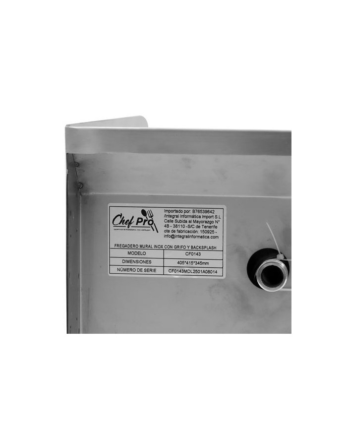 El CHEF PRO CF0143 es un lavamanos mural de acero inoxidable, ideal para cocinas profesionales, bares, restaurantes, laboratorios y cualquier entorno donde la higiene sea prioritaria. Su diseo compacto permite instalarlo en espacios reducidos, manteniendo la mxima funcionalidad. Incorpora backsplash lateral y trasero para evitar salpicaduras en la pared. Incluye grifo integrado y cubeta profunda para un lavado cmodo y seguro. Dimensiones totales: 405 415 345 mm Medida de la cubeta: 330 280 170 mm Medida del embalaje: 475 465 405 mm Peso neto: 4,7 kg Peso bruto: 5,45 kg Materiales: - Construccin en acero inoxidable de alta resistencia - Cubeta profunda para mayor capacidad - Grifo integrado