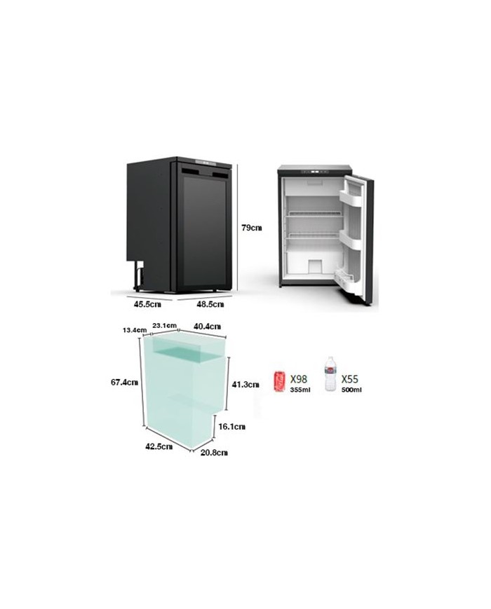 Capacidad 83 litros Conexin 12/24V Conexin 220V con adaptador (no includo) Consumo 80W Apertura frontal, doble lado (D/I) con trabas para evitar apertura accidental Tres modos de proteccin para la batera del vehculo Luz led interior Temperatura regulable entre 8 y -20 Dos zonas de frio separadas con control de temperatura independiente desde el panel o desde APP "car fridge freezer" disponible en espaol para IOS y Android Medidas exteriores 48.5cm(ancho)X45.5cm(fondo)X79cm(alto) Medidas interior 42.5cm(ancho)X36.5cm(fondo)X67.4cm(alto)