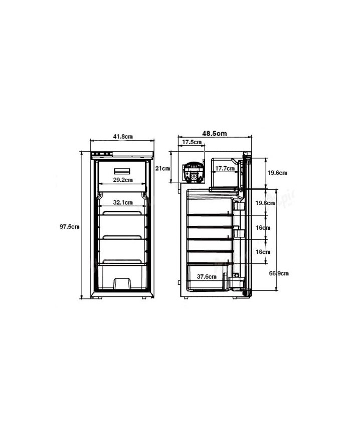 Capacidad 91 litros Conexin 12/24V Conexin 220V con adaptador (no includo) Compresor LG Consumo 80W Apertura frontal, doble lado (D/I) con trabas para evitar apertura accidental Tres modos de proteccion para la batera del vehculo Luz led interior Temperatura regulable entre 8 y -20 Dos zonas de frio separadas con control de temperatura independiente desde el panel o desde APP "car fridge freezer" disponible en espaol para IOS y Android. Medidas exteriores 41.8X48.5X97.5cm