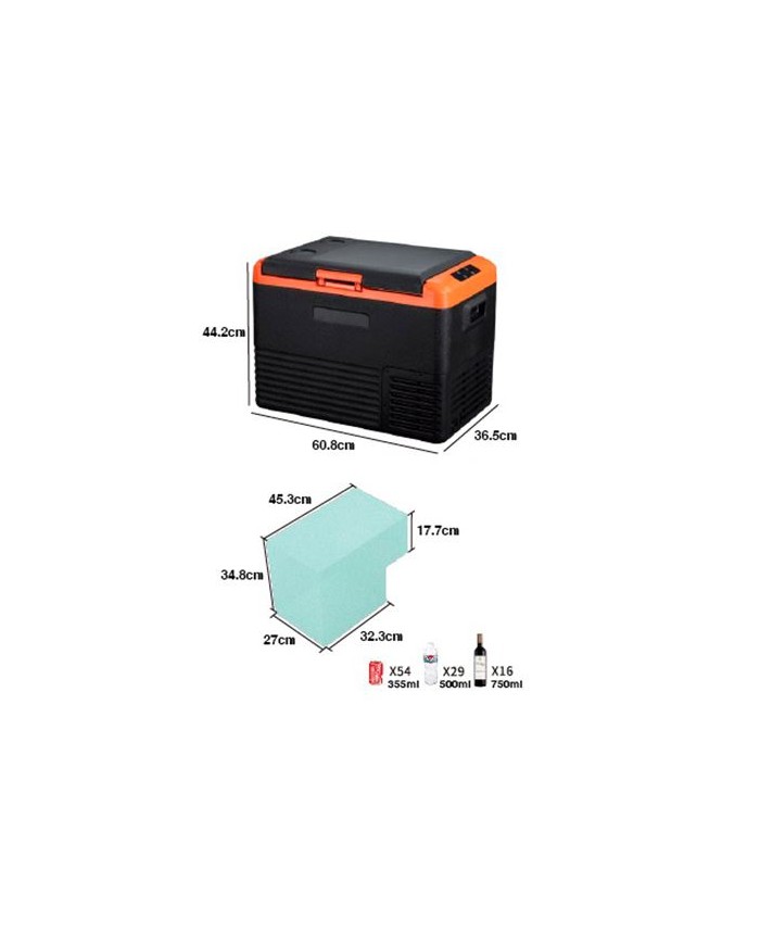 Capacidad 37 litros Modos de proteccin para la batera del vehculo Temperatura entre -20/+20 Conexin 12/24/220V Consumo 55W Compresor silencioso Display de control Bluetooth para manejar desde la APP "car fridge freezer" disponible en espaol para IOS y Android Medidas exteriores 60.8X36.5X44.2CM Medidas interiores 45.3X27X34.8CM