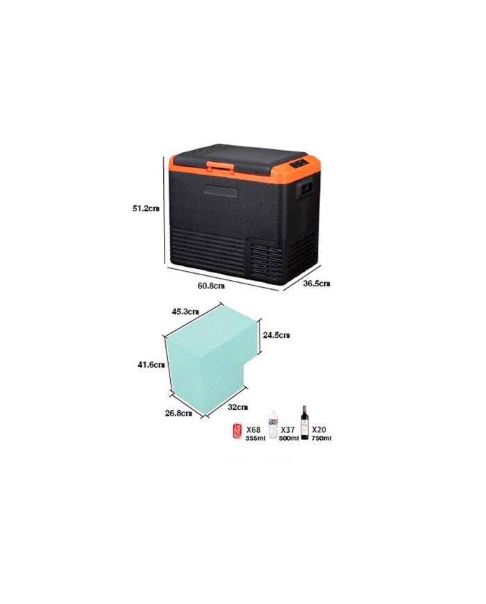 Capacidad 45 litros Modos de proteccin para la batera del vehculo Temperatura entre -20/+20 Conexin 12/24/220V Consumo 70w Compresor silencioso Display de control Bluetooth para manejar desde la APP "car fridge freezer" disponible en espaol para IOS y Android Medidas exteriores 60.8X36.5X51.2CM Medidas interiores 45.3X26.8X41.6CM
