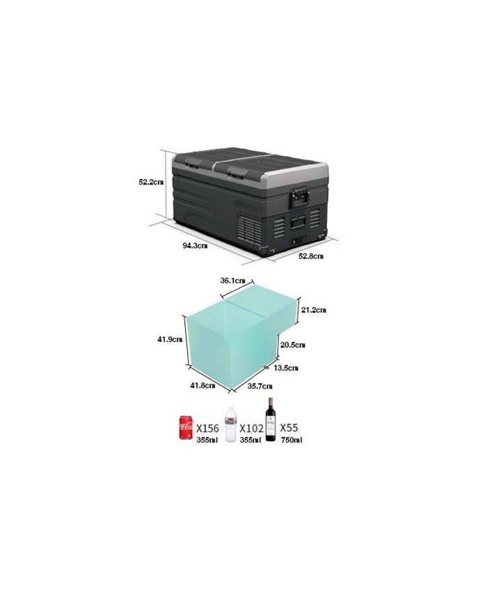 Capacidad 107 litros Tres modos de proteccin para la batera del vehculo Luz led interior Temperatura entre -20/+20 Conexin 12/24/220V Consumo 60W Compresor silencioso LG Opcin de funcionar a bateria (no incluida) Opcin de carga mediante panel solar (no incluido) Display de control Bluetooth para manejar desde la APP "car fridge freezer" disponible en espaol para IOS y Android Posibilidad de aadir batera adicional referencia MV0477 Doble zona de frio regulable Doble puerta Medidas exteriores 94.3x52.8x52.2cm Medidas interiores 35.7x41.8x41.9cm Medidas interiores 36.1x41.8x21.2cm Abridor de botellas incorporado y tapon de drenaje