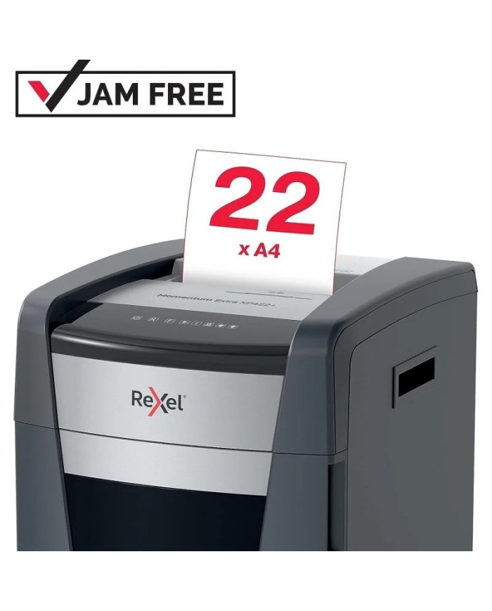 Las destructoras de papel sin atascos Rexel Momentum Extra son ideales para destruir documentos confidenciales en la oficina. La destructora XP422+ destruye hasta 22 hojas de papel A4 (80 grs) de una sola vez a través de la ranura de alimentación manual en piezas de corte transversal P-4 (4x35mm). L