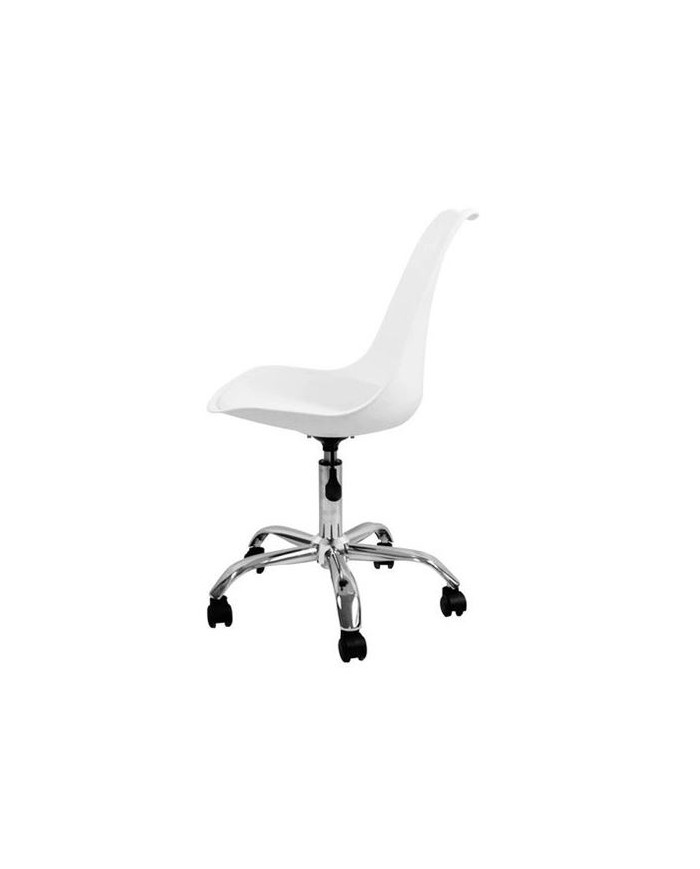 Silla de escritorio con ruedas, ideal para uso en oficinas o espacios particulares como dormitorios, despachos o salas de trabajo y estudio. Construida con estructura en polipropileno y asiento de espuma de poliuretano recubierto de PVC, lo que proporciona una mayor comodidad. Dispone de patas de acero cromado con 5 ruedas auto bloqueantes. Esta silla para escritorio de estilo nrdico es muy fcil de limpiar con un pao seco simplemente para eliminar el polvo, o con un pao ligeramente humedecido para quitar manchas. No emplear nunca para su limpieza productos abrasivos o derivados amoniacales.TODAS LAS MEDIDAS QUE NECESITAS 47 x 58 x 97 cm (largo x ancho x alto) Altura del asiento: 44,5 - 53,5 cm Profundidad del asiento: 54 cm Extensin y eleva