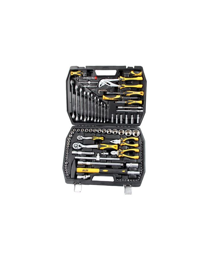 13 x Vasos 1/2": 10-11-12-13-14-15-17-19-22-24-27-30-32mm 2 x Barras de extensin 1/2, 5 - 10. 2 x Vasos 1/2 de buja 16 - 21mm. 1 x Chicharra 1/2 de 72 dientes con expulsor de vasos. 1 x Articulacin universal 1/2. 1 x Mango corredizo T 1/2 . 1 x Chicharra 1/4 de 72 dientes con expulsor de vasos. 12 x Vasos 1/4: 4-4.5-5-5.5-6-7-8-9-10-11-12-13mm. 6 x Vasos largos 1/4: 6-7-10-11-12-13mm. 6 x Vasos Torx 1/4: E4-E5-E6-E7-E8-E10 2 x Barras de extensin 1/4, 3 - 6. 1 x Mango corredizo T 1/4. 1 x Mango destornillador 1/4. 1 x Articulacin universal 1/4. 1 x Adaptador 1/4 para puntas. 1 x Barra de extensin flexible 1/4. 1 x Alicate de corte diagonal de 6. 1 x Alic