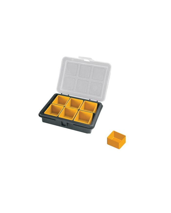 Este compacto organizador de plstico incluye 6 compartimentos internos extrables, perfectos para clasificar tornillos, tacos, clips, tuercas y pequeos accesorios. Con unas dimensiones de 120 x 100 x 28 mm, es ideal para llevar en la mochila, almacenar en cajones o tenerlo siempre a mano en el taller. Compartimentos desmontables para una organizacin flexible Tapa transparente para fcil identificacin del contenido Tamao reducido, ideal para el da a da