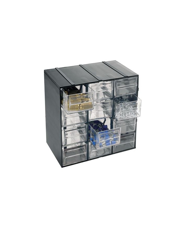 Material: Plstico resistenteMedidas: Largo 190 mm Profundidad 142 mm Alto 228 mmEquipado con 12 cajones transparentesIdeal para guardar tornillos, piezas pequeas o material de oficinaDiseo compacto y apilableFcil de limpiar y mantener