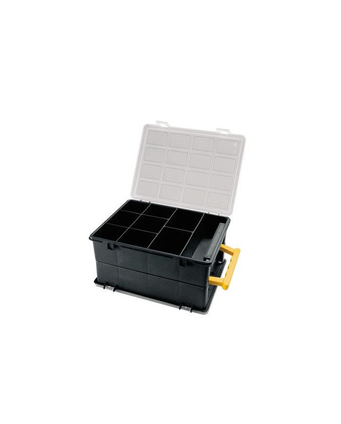 Organizador dobleMaterial: Plstico resistenteMedidas: Largo 242 mm Profundidad 188 mm Alto 120 mmIncluye divisores internos ajustablesTapa transparente para fcil visualizacin del contenidoDiseo compacto y apilableIdeal para almacenar tornillos, clavos y accesorios pequeos