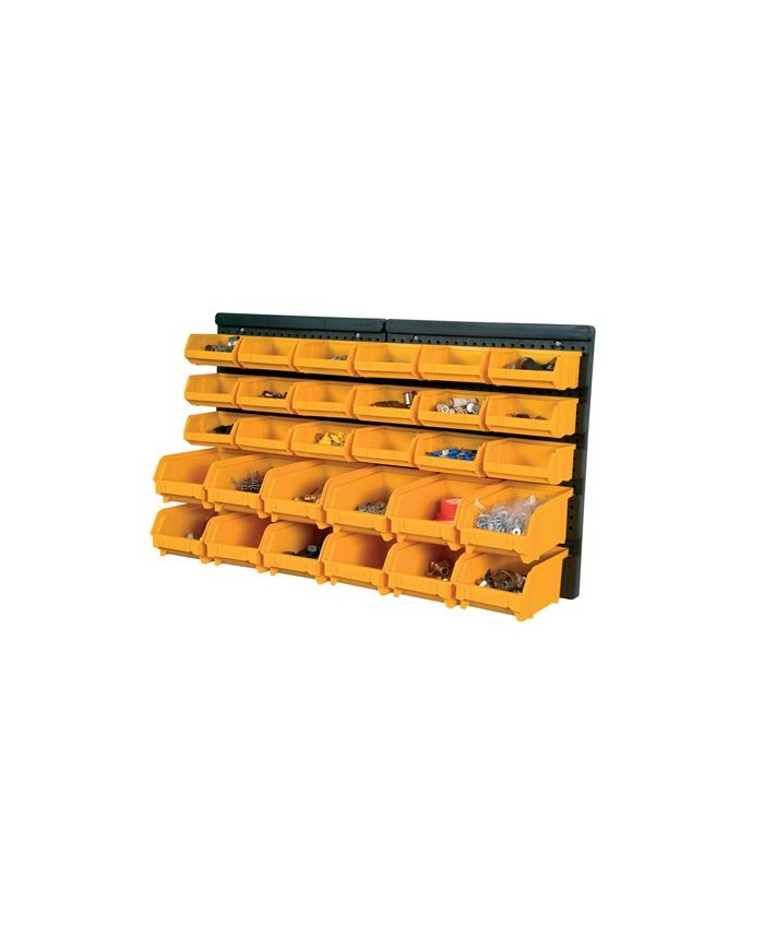 Este sistema mural est compuesto por un resistente panel de polipropileno y 30 cubetas desmontables (18 cubos art.101 + 12 cubos art.102), ideal para clasificar piezas pequeas, accesorios y consumibles en talleres, almacenes o zonas de bricolaje. Sus dimensiones (646 x 180 x 385 mm) permiten aprovechar al mximo el espacio disponible con una visibilidad total del contenido. 30 cubos para clasificacin eficiente Panel robusto y fcil de instalar Solucin profesional para organizacin vertical