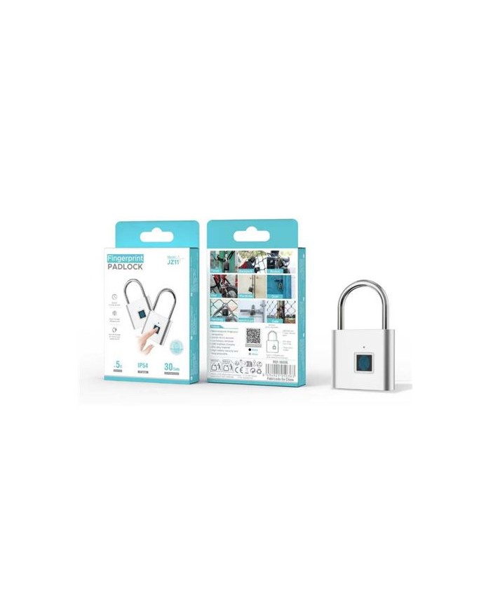candado con huella dactilar JZ11, tambin conocido como "Fingerprint Padlock". Funciona sin llaves ni contraseas, usando tecnologa de reconocimiento biomtrico. Permite almacenar hasta 10 huellas dactilares diferentes. Cuenta con certificacin IP54, lo que indica resistencia limitada al polvo y salpicaduras de agua.