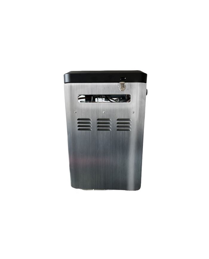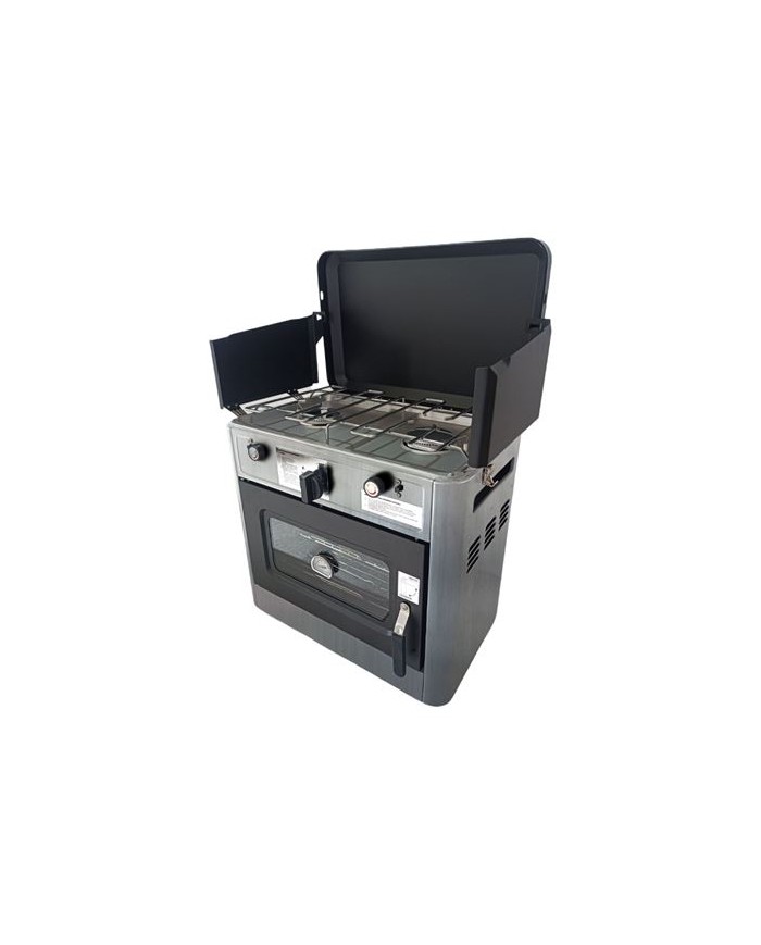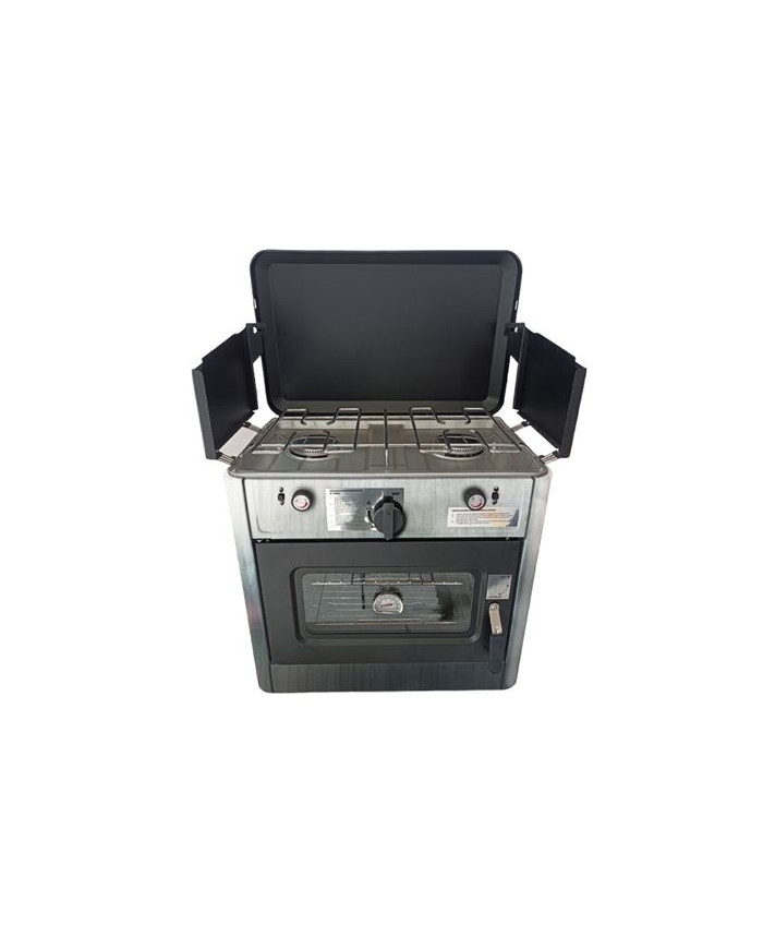 Material de acero inoxidable Incluye sistema de seguridad que desconecta la salida de gas cuando el fuego se apaga. Encendido piezoelctrico 2 fuegos. Cocina esmaltada antiadherente. Tapa plegable y asas para transporte Incluye termmetro para horno, bandeja interior y rejilla. Horno de 15 litros de capacidad. Pantalla paravientos. Dimensiones tapa abierta: 51x36.5x70.5 cm (ancho x fondo x alto) Dimensiones tapa cerrada: 49x34x45.5 cm (ancho x fondo x alto) Peso: 15Kg