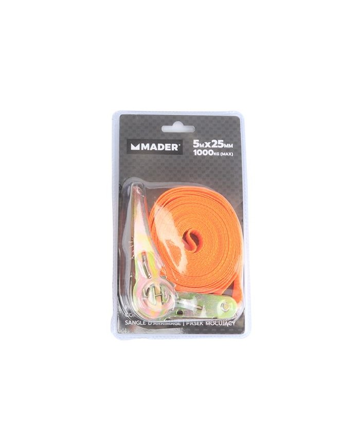 Eslinga plana de doble capa con gaza reforzada de polister muy flexible y ligera. Polister de alta tenacidad con tratamiento adicional que la hace resistente a los agentes atmosfricos externos. Se utiliza para la sujecin o elevacin de diversos materiales. Carga de trabajo en tiro recto 1000 Kg. Dimensiones: 5m x 25mm
