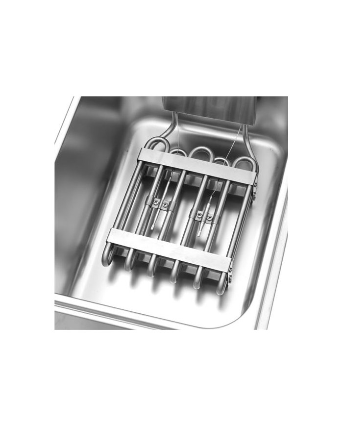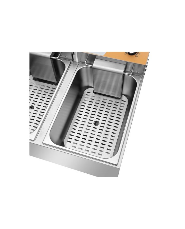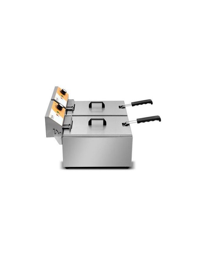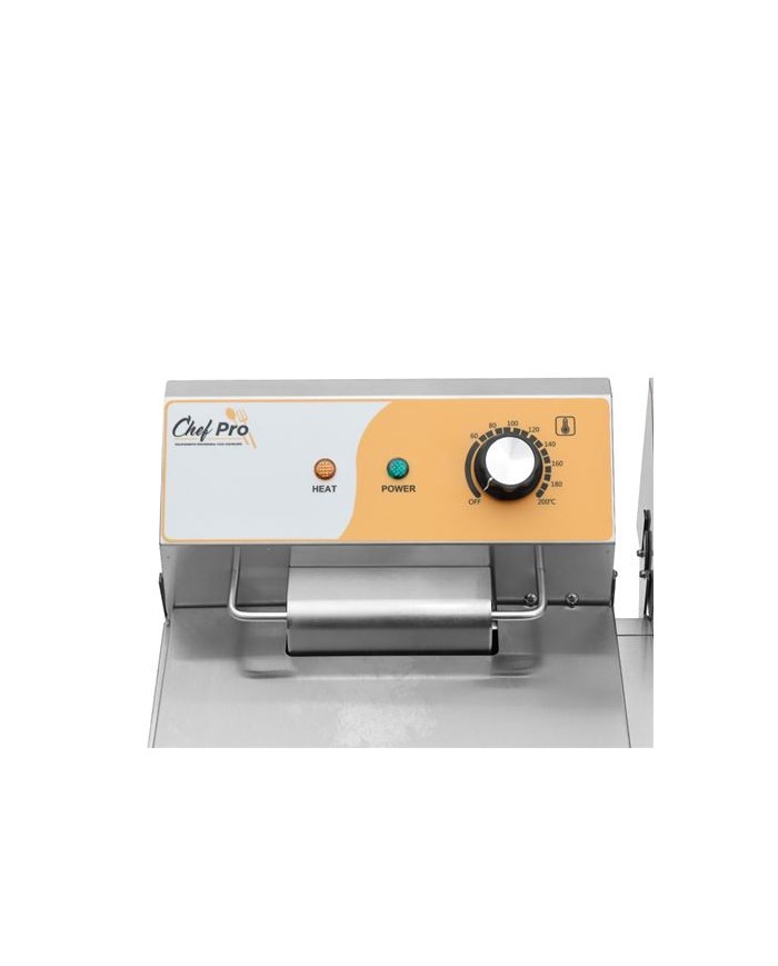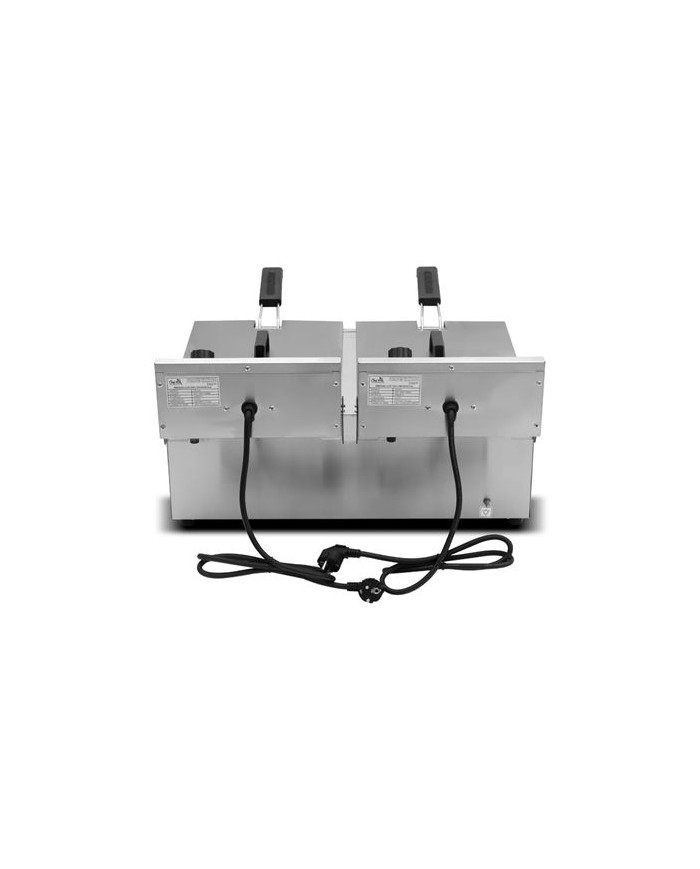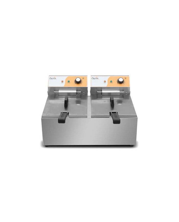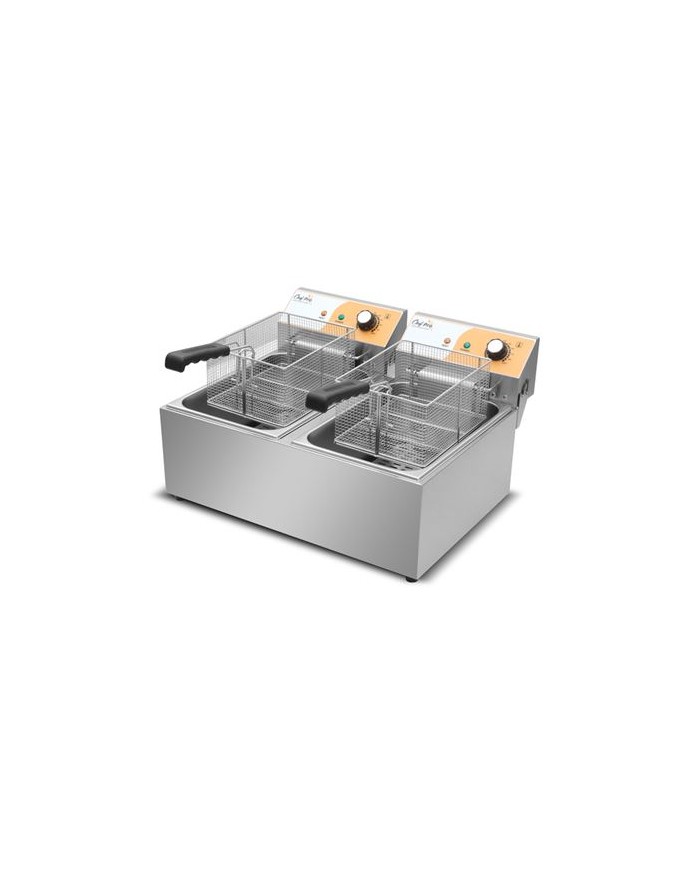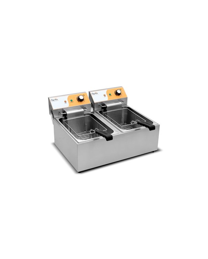 Freidora elctrica doble de 2 11 litros CHEF PRO, ideal para restaurantes, hoteles y negocios de hostelera con gran volumen de fritura. Equipada con dos cubas independientes de acero inoxidable y potencia total de 6 kW (2 3 kW).La freidora elctrica doble CHEF PRO CF0103 est diseada para un uso intensivo en cocinas profesionales que requieren mxima productividad y eficiencia. Cada cuba funciona de manera independiente, lo que permite frer diferentes alimentos al mismo tiempo sin mezclar sabores.Fabricada en acero inoxidable con cestas de alta resistencia, incorpora termostato regulable, micro switch de seguridad y limitador de temperatura, garantizando un control seguro y preciso en todo momento.Especificaciones tcnicas - Volta
