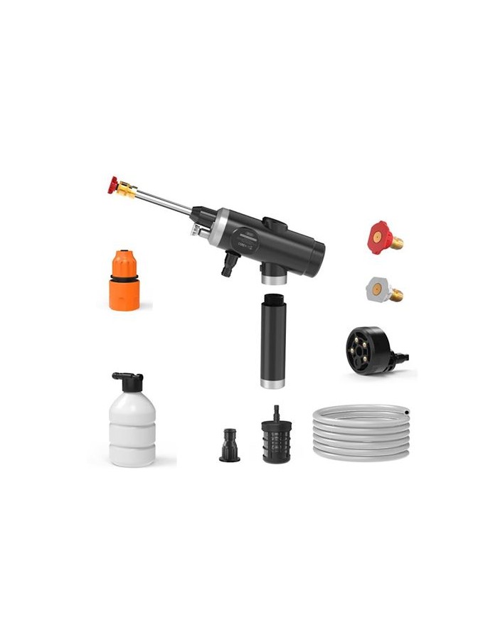 es una pistola de agua inalmbrica con muchas aplicaciones, como el lavado de coches/suelos/ventanas, la pulverizacin de plantas y muchas ms. Viene con un cargador, 2 boquillas y un cable de agua de 5 m. La tasa de flujo de agua es de 2 L/min y el tiempo de carga vara de 3.5 a 5.5 horas. El dispositivo tiene una potencia de 45 W.