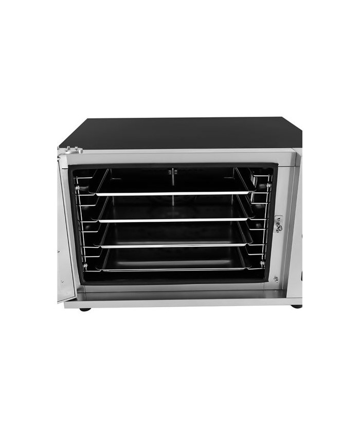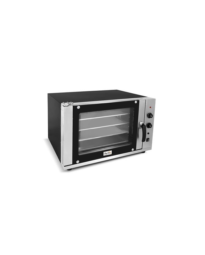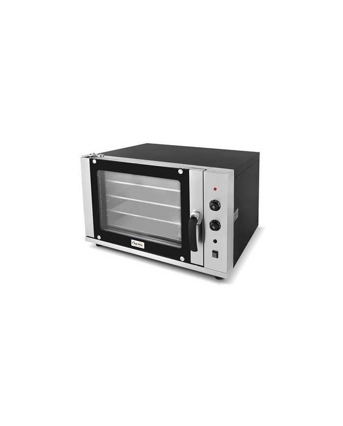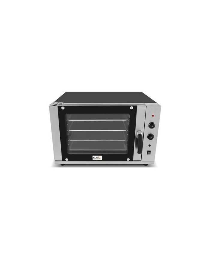 El Horno de Conveccin Elctrico CHEF PRO CF0120 es la solucin ideal para panaderas, pasteleras, cafeteras y cocinas profesionales. Gracias a su ventilacin forzada, garantiza una coccin homognea en todas las bandejas, optimizando tiempos y asegurando resultados consistentes. Cámara de coccin: 620 420 450 mm Incluye 4 bandejas GN 1/1 (580 400 mm) Sistema de conveccin forzada para coccin uniforme Temperatura regulable: 50C 350C Funcin de spray de humedad para panadera y repostera Puerta con doble cristal para mxima eficiencia energticaEspecificaciones tcnicas: - Voltaje: 220-240V / 50Hz - Potencia: 6 kW - Dimensiones: 880 800 595 mm - Dimensiones embalaje: 1040 930 710 mm - Peso