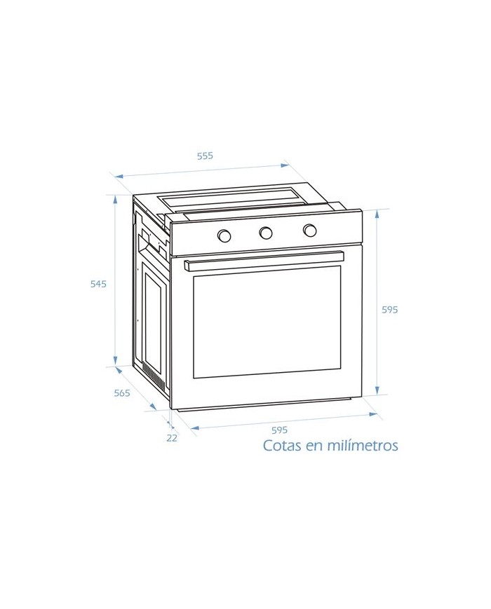 60 litros de capacidad 2300 W de potencia mxima Eficiencia energtica clase A Frontal en cristal templado 7 modos de funcionamiento Puerta del horno con doble cristal templado Temporizador mecnico hasta 90 minutos Control de temperatura de 40 C a 240 C Iluminacin interior Limpieza con vapor Cavidad del horno revestida con esmalte Incluye bandeja esmaltada y parrilla Dimensiones: 595 x 587 x 595 mm (l, a, alto) Peso: 28,5 Kg