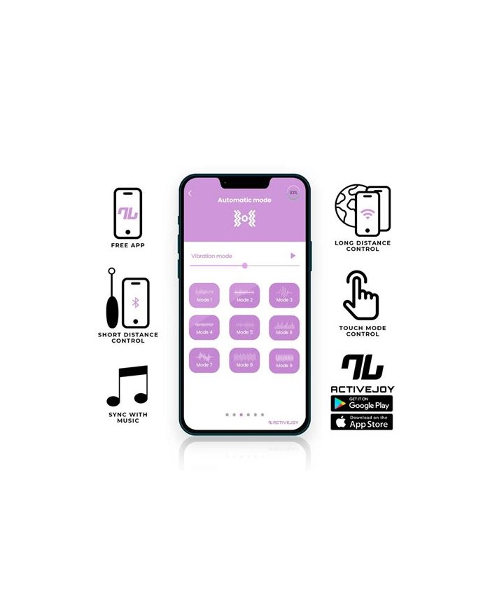 App gratuita ActiveJoy para IOS y Android Descarga fcil sin necesidad de registros Juego local va bluetooth a corta distancia Juego global va internet a larga distancia Sincronizacin con tu msica Modo tctil Touch Control 10 velocidades Diversidad de modos de interaccin Control total con Touch Control Silicona doble capa hiper sedosa Recargable por USB Impermeable 20 cm (incluyendo el cordn de silicona) 7 cm x 3.3 cm