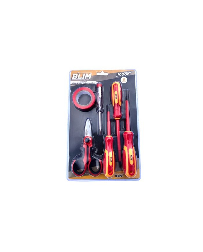 Juego de herramientas aisladas 1.000V. BLIM de 6 piezas. El kit contiene: 1 tijera de electricista. 1 rollo de cinta aislante. 1 busca polos de 140 mm. 1 destornillador aislado punta plana de 5.5x125. 2 destornilladores Phillips de PH1x80 y PH2X100.