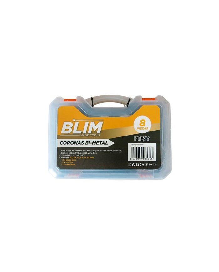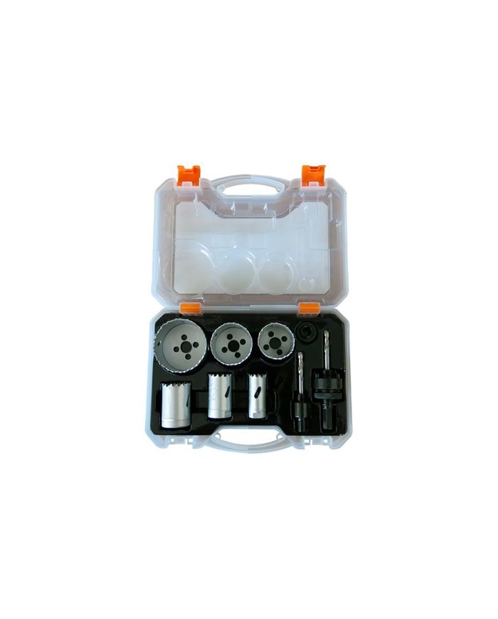 Este juego de coronas es adecuado para cortar acero, aluminio, bronce, cobre, PVC, acrlico y madera. Uso taladro sin percusin. Medidas: 22, 29, 35, 44, 51, 64 mm 2 X broca gua 2 x husillos 1 x adaptador