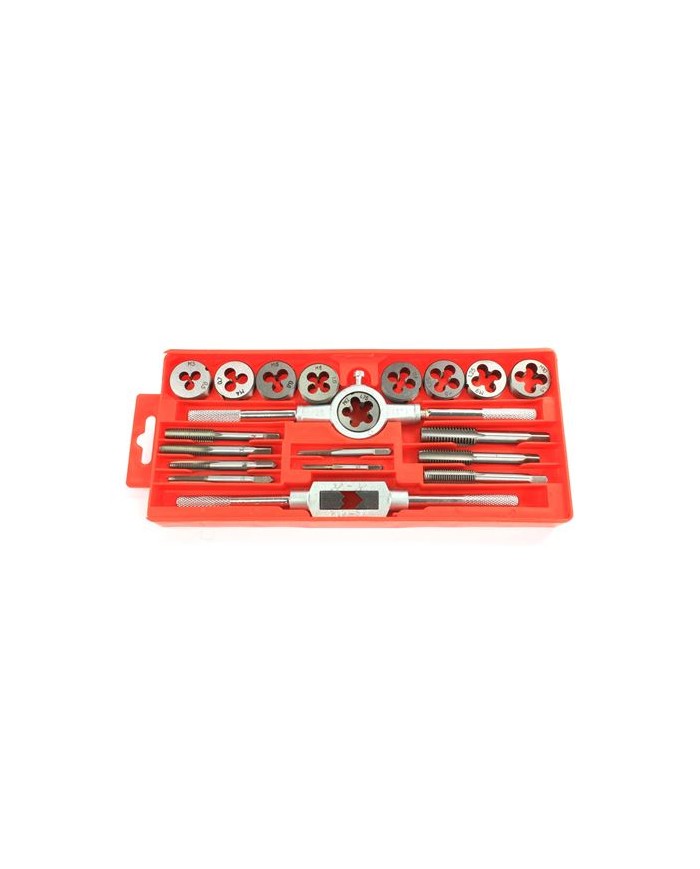 Juego de 20 piezas 9 UN - MACHOS M3x0.5; M4x0.7; M5x0.8; M6x1; M7x1; M8x1.25; M9x1.25; M10x1.5; M12x1.75 9 UN - COJINETES M3x0.5; M4x0.7; M5x0.8; M6x1; M7x1; M8x1.25; M9x1.25; M10x1.5; M12x1.75 2 UN - TERRAJA Machos - M3-M12 Cojinetes - 25mm