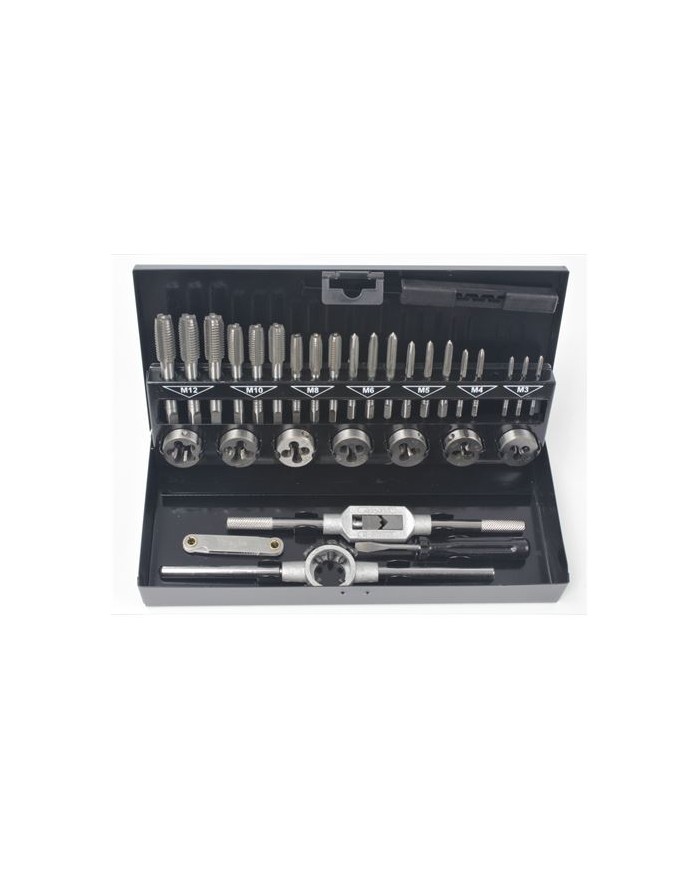 Caja metlica. 21 UN - MACHOS Conico - M3x0.5; M4x0.7; M5x0.8; M6x1; M8x1.25; M10x1.5; M12x1.75 Punto - M3x0.5; M4x0.7; M5x0.8; M6x1; M8x1.25; M10x1.5; M12x1.75 Derecho - M3x0.5; M4x0.7; M5x0.8; M6x1; M8x1.25; M10x1.5; M12x1.75 7 UN - COJINETES M3x0.5; M4x0.7; M5x0.8; M6x1; M8x1.25; M10x1.5; M12x1.75 3 UN - TERRAJA Machos - M3; M12 Cojinetes - 25mm 1 UN - LLAVE 1 UN - PATRN ROSCAS