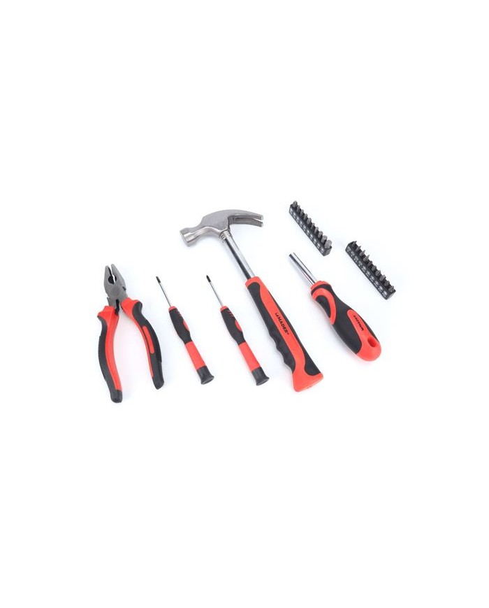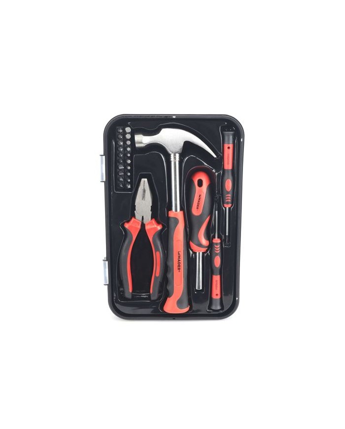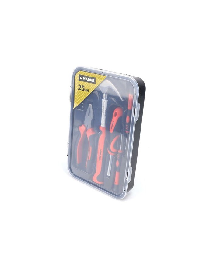 Juego 25 unidades 1un - Martillo orejas: 8OZ 1un - Porta puntas 1un - Alicate universal: 6" 2un - Llaves de precisin 20un - Puntas CRV: 25mm