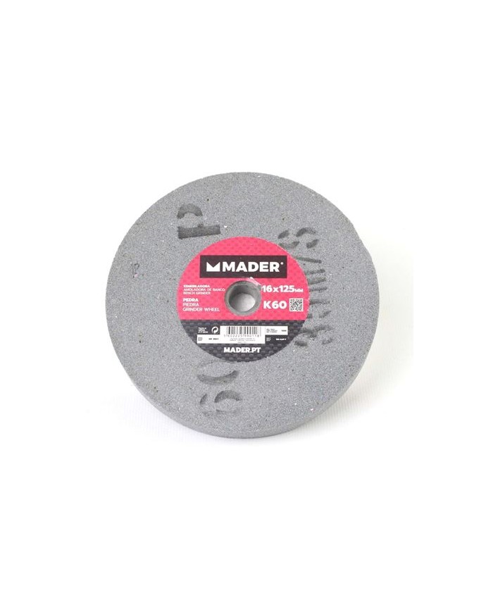 Muela esmeriladora de 16 mm de calibrado y grano de 60. Dispone de 12,5mm. de dimetro del agujero del disco, e indicada para utilizar sobre superficies de acero. Medidas: 125 mm de dimetro.