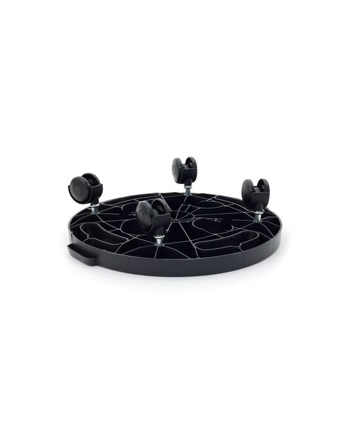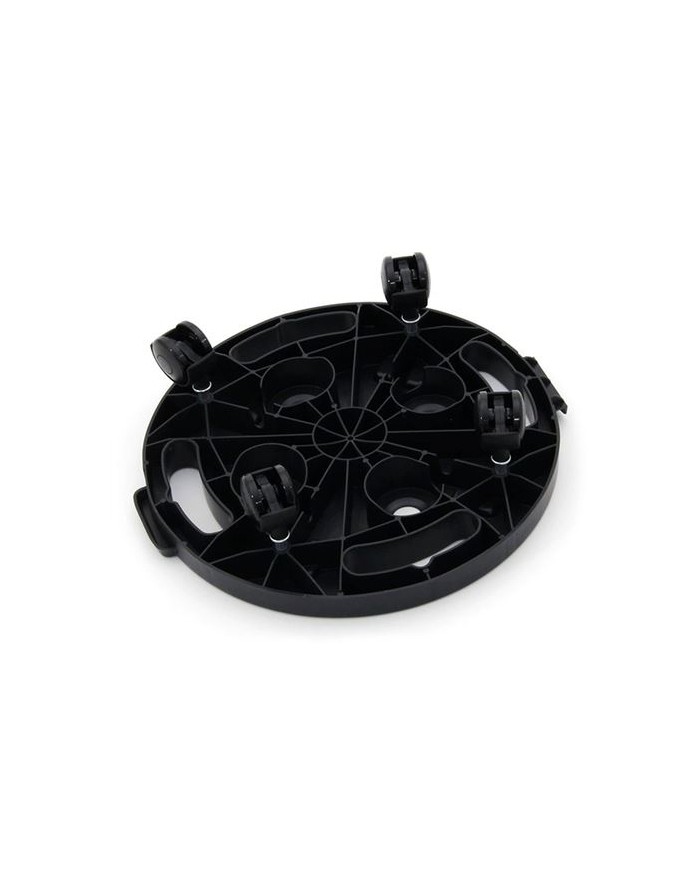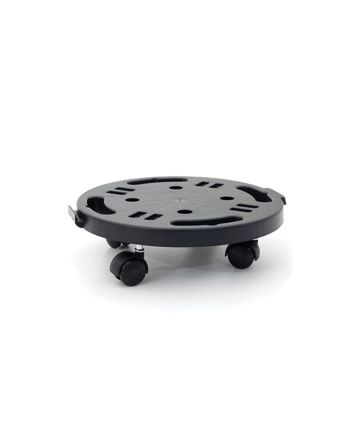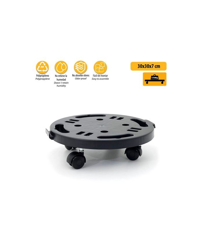 Plataforma circular con 4 ruedas giratorias de alta movilidad Ideal para mover macetas grandes, cubos, sillas, bidones u objetos de base redonda Compacta y ligera, con estructura antideslizante Diseo robusto y bajo perfil para mayor estabilidad Apta para uso domstico, en oficinas o pequeos talleres Medidas: - Base: 300 300 30 mm - Altura total montada: 70 mm Material: Polipropileno resistente Capacidad de 170 kg Color: Negro