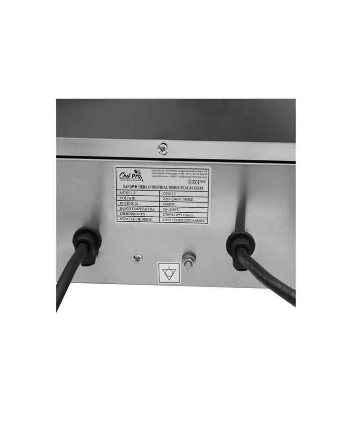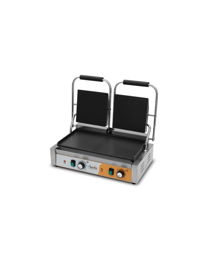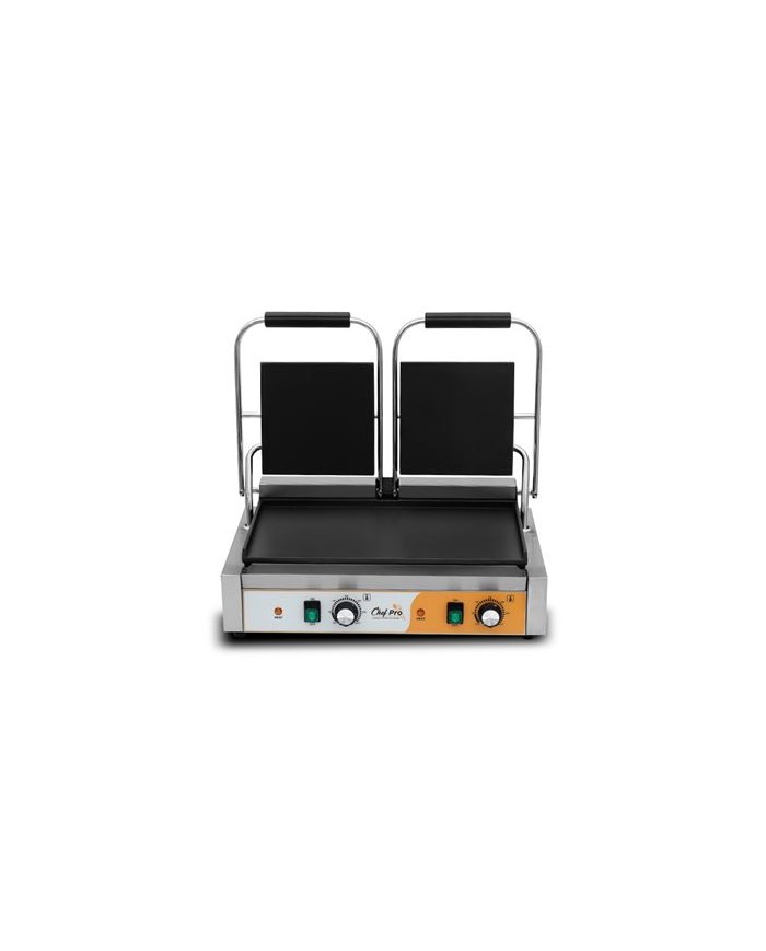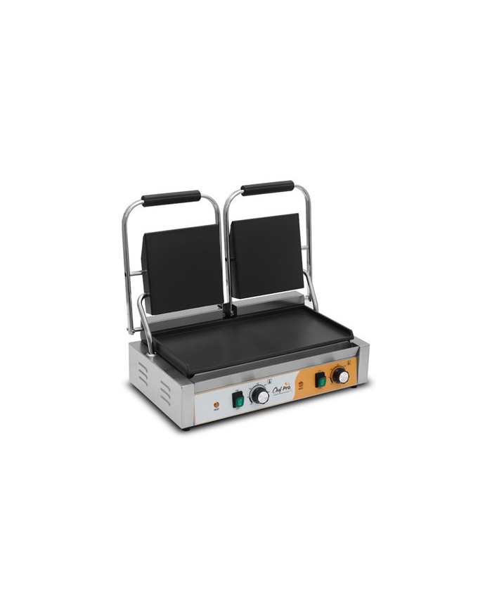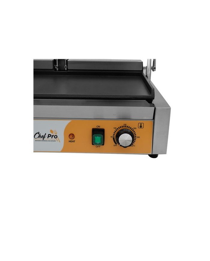 Grill elctrico profesional CHEF PRO de doble zona con placas superiores e inferiores lisas, diseado para preparar paninis, sndwiches, carnes, pescados y verduras con rapidez y uniformidad.El modelo CHEF PRO CF0112 destaca por su gran tamao de coccin (500 280 mm) y su potencia total de 3600W, lo que lo convierte en la opcin ideal para cocinas con alto volumen de trabajo en bares, restaurantes, hoteles y caterings.Construido en acero inoxidable con placas esmaltadas resistentes hasta 800C, cuenta con termostato regulable de 50300C, asegurando un control preciso de la coccin y una larga durabilidad en entornos profesionales.Especificaciones tcnicas - Voltaje: 220-240V / 50Hz - Potencia: 3,6 kW - Tipo de placas: Lisa arr