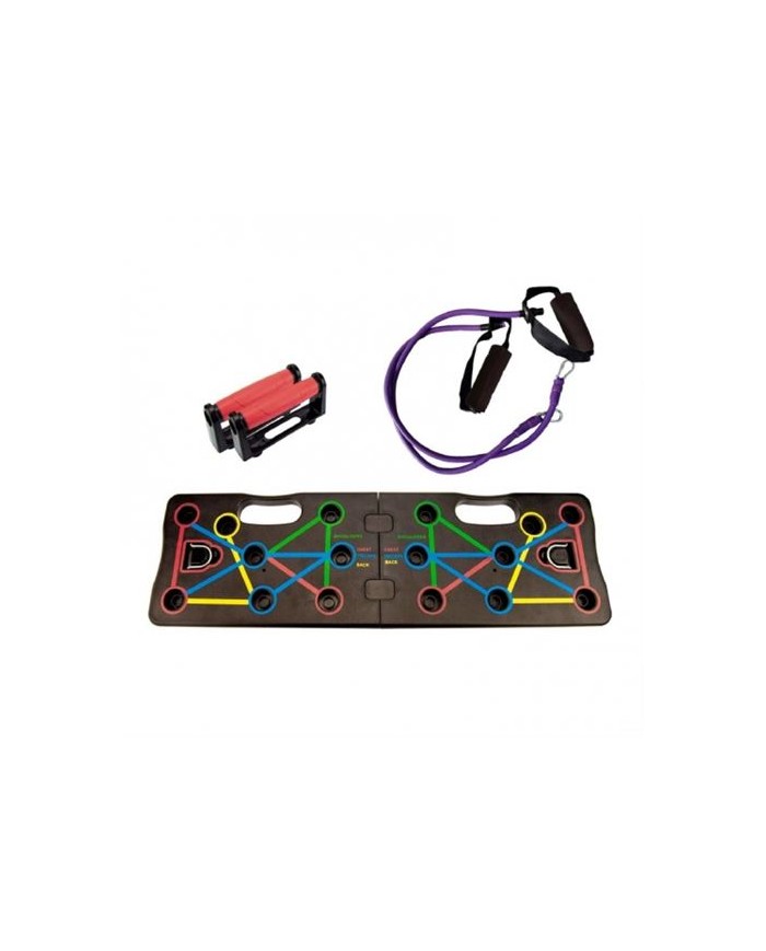 Desarrolla los msculos de hombros, pecho, trceps y espalda. Exclusivo sistema codificado por colores, identifica los grupos de msculos trabajados Maximiza la fuerza y la resistencia de la parte superior del cuerpo Plegable y porttil Se puede utilizar junto con las bandas de resistencia Ajuste la distancia de forma autnoma segn su nivel. Zona amarilla: msculos de la espalda. Zona roja: pectoral / deltoides. Zona verde: msculos de los hombros. Zona azul: trceps.
