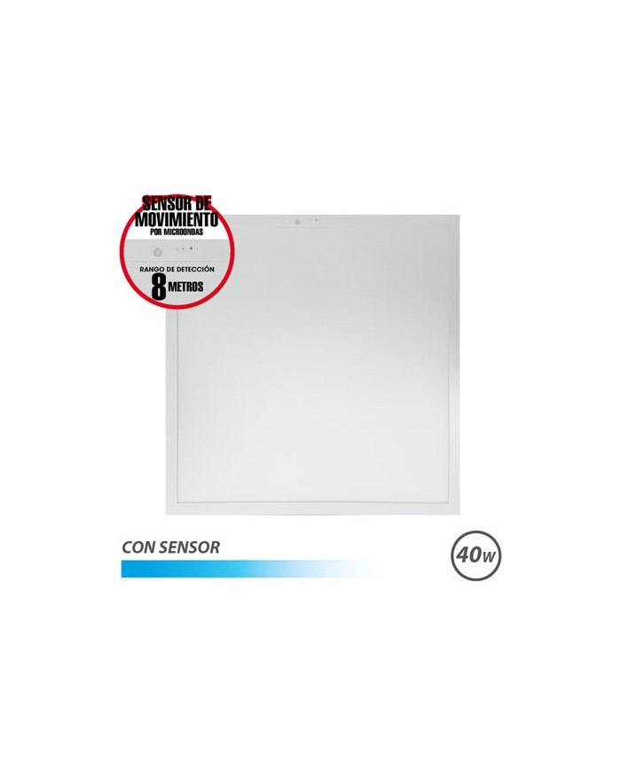 Potencia: 40W Lumenes: 4.600 Sensor de movimiento por microondas. Detecta movimiento en un rango de hasta 8 metros. Se enciende cuando detecta movimiento durante 30 segundos y luego se vuelve a apagar. Luz fra: 6500K Medidas: 60x60x3cm. AC 220-240V. Retroiluminado Marco color blanco 50.000 horas de vida. Angulo: 112. Encendido inmediato.
