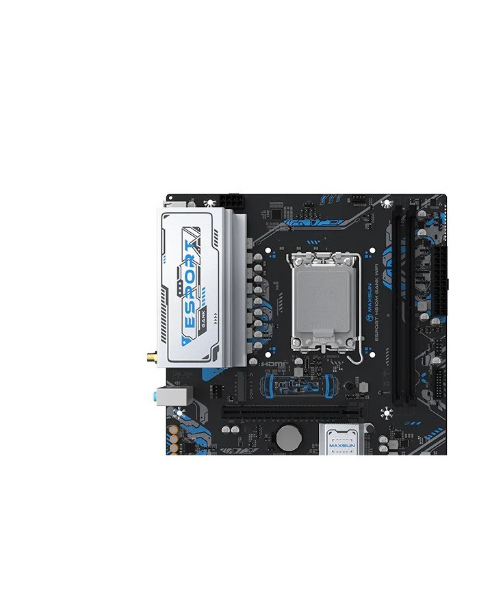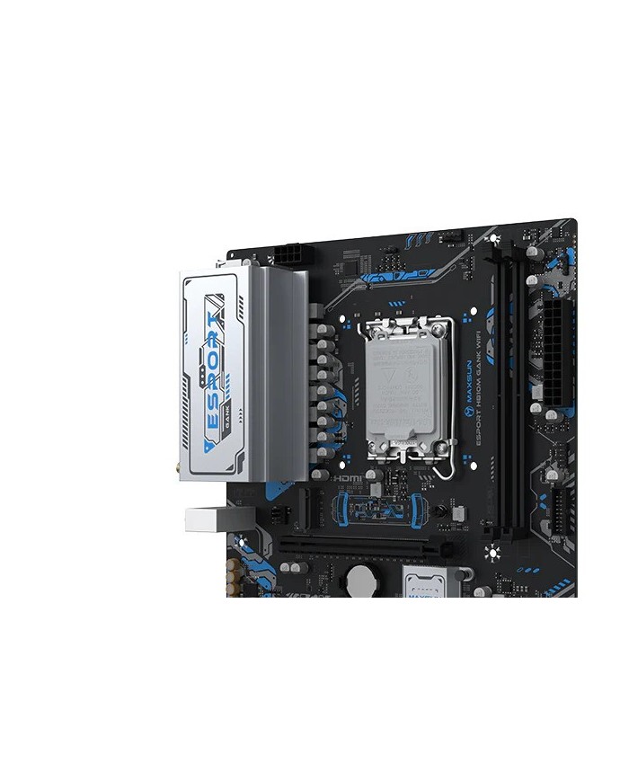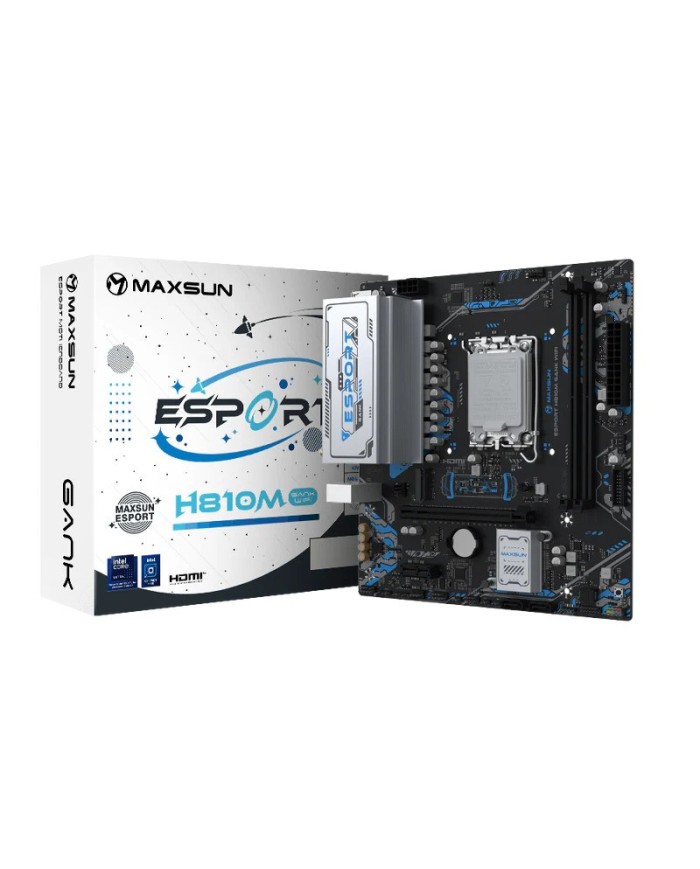 La MAXSUN MS-eSport H810M GANK WIFI es una placa base Micro-ATX con socket LGA1851 y chipset Intel H810, pensada para montar un PC moderno con Intel Core Ultra._x000D_ Ofrece DDR5 hasta 128GB, PCIe 5.0 x16, M.2 PCIe 4.0 y conectividad Wi-Fi 6 + Bluetooth 5.2 para un equipo rpido y actualizado.