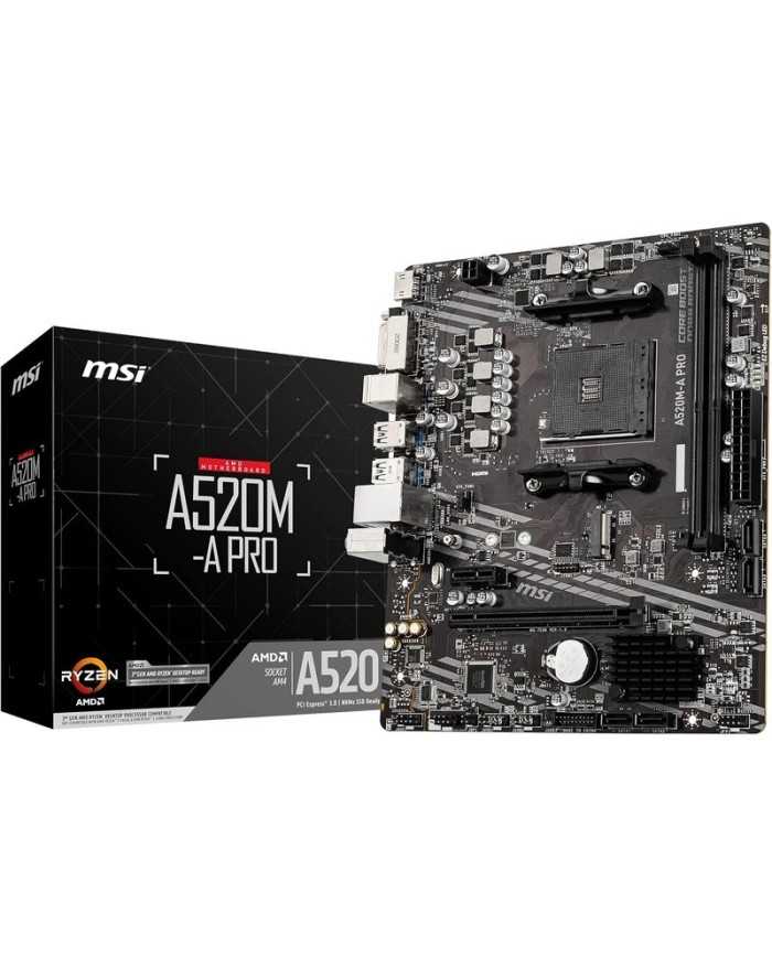 Placa base MSI A520M-A PRO (socket AM4, formato Micro-ATX) con chipset AMD A520, soporte para procesadores Ryzen de 3. y 5. generacin, HDMI/DVI y soporte para memoria DDR4.