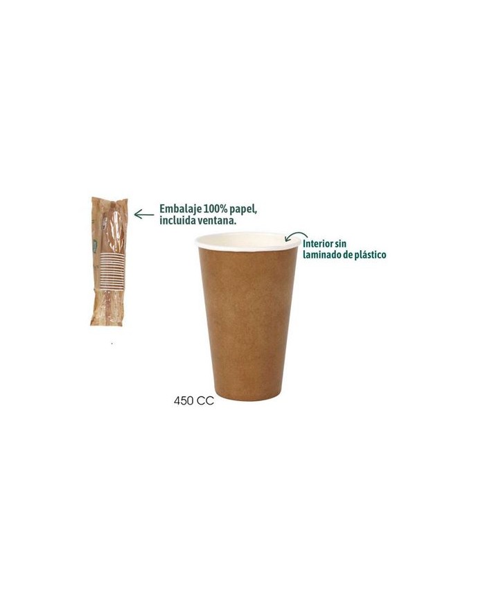 Vaso ecolgico de cartn con capacidad de 450 cc, ideal para bebidas fras o calientesFabricado 100% en papel sin laminado plstico en el interiorTotalmente compostable y respetuoso con el medio ambienteEmbalaje exterior tambin fabricado ntegramente en papel, con ventana incluida y sin uso de plsticosOpcin sostenible para eventos, hostelera o uso domsticoPack de 15 unidades