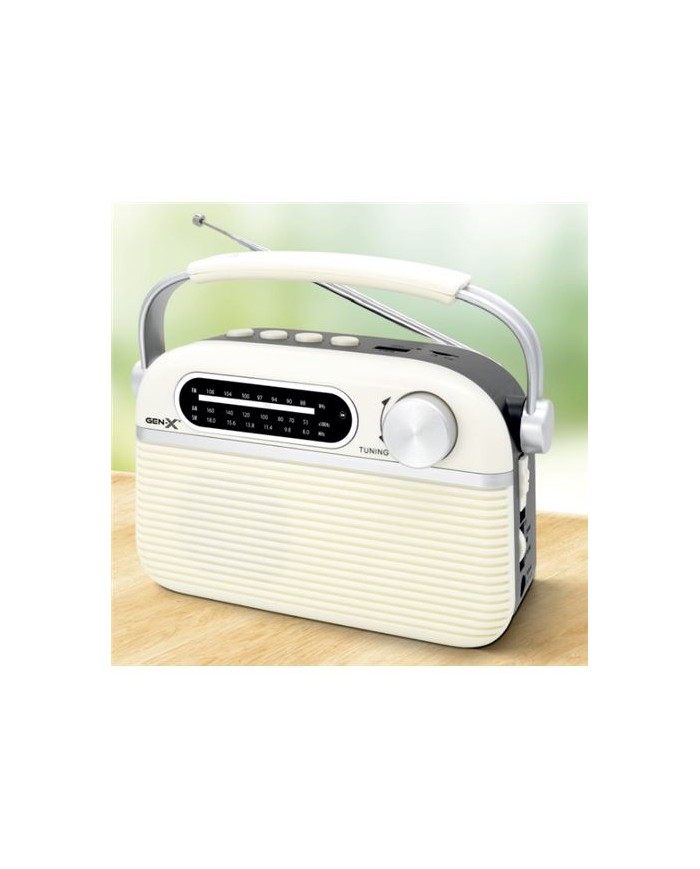 Radio porttil de estilo clsico con diseo retro y acabados en tonos crema y negro, ideal para uso en interiores o exteriores . Funcin Bluetooth integrada que permite la reproduccin inalmbrica de msica desde smartphones, tablets o laptops . Sintonizador multibanda con recepcin en 3 bandas: AM, FM y SW, para una amplia cobertura de estaciones locales y de onda corta.Entrada USB compatible con memorias para reproducir archivos de msica sin necesidad de conexin externa.Lector de tarjetas TF (microSD), lo que ampla las opciones de reproduccin desde almacenamiento porttil.Incluye batera recargable interna de 2000 mAh que permite un uso prolongado sin conexin directa a corriente.Entrada de alimentacin