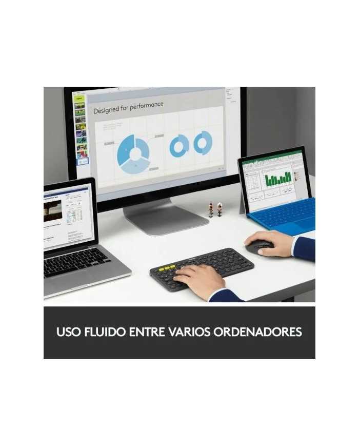 - Multidispositivo: desplaza el cursor, textos, imágenes y archivos entre 3 computadoras con Logitech FLOW. Navega fácilmente entre 3 computadoras o portátiles, con solo tocar un botón.
