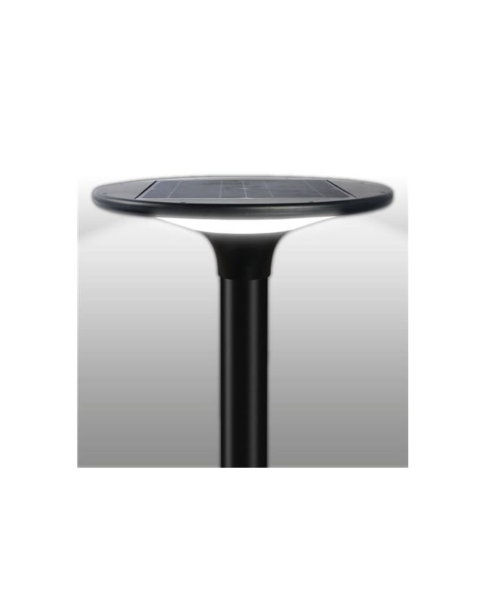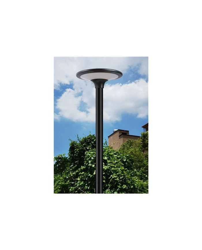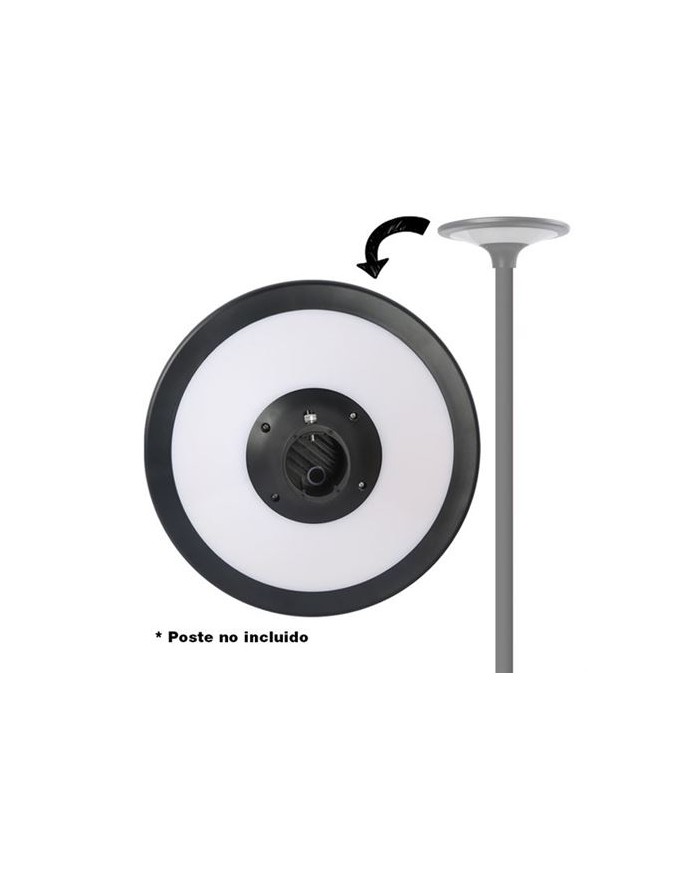 20W, 2100 Lumens Se pueden configurar 2 temperaturas de luz de funcionamiento: 3000K y 6000K Batera 6.4V, 6000mah, 38.4Wh Panel solar: 10V, 12.5W IP65 2 modos de trabajo: encendido automtico 100% cuando llega la noche o encendido automtico 50% cuando llega la noche. (configurable con botonera) Dimensiones lmpara: 400mm de dametro x 120mm de altura Rango de iluminacin efectiva: 80 metros cuadrados Altura de instalacin recomendada: 2 - 4 metros. Espacio de instalacin recomendado entre farolas: 10 - 15 metros. ngulo de iluminacin: 360 Dimetro interno para colocar poste: 50 - 60 mm Poste no includo.